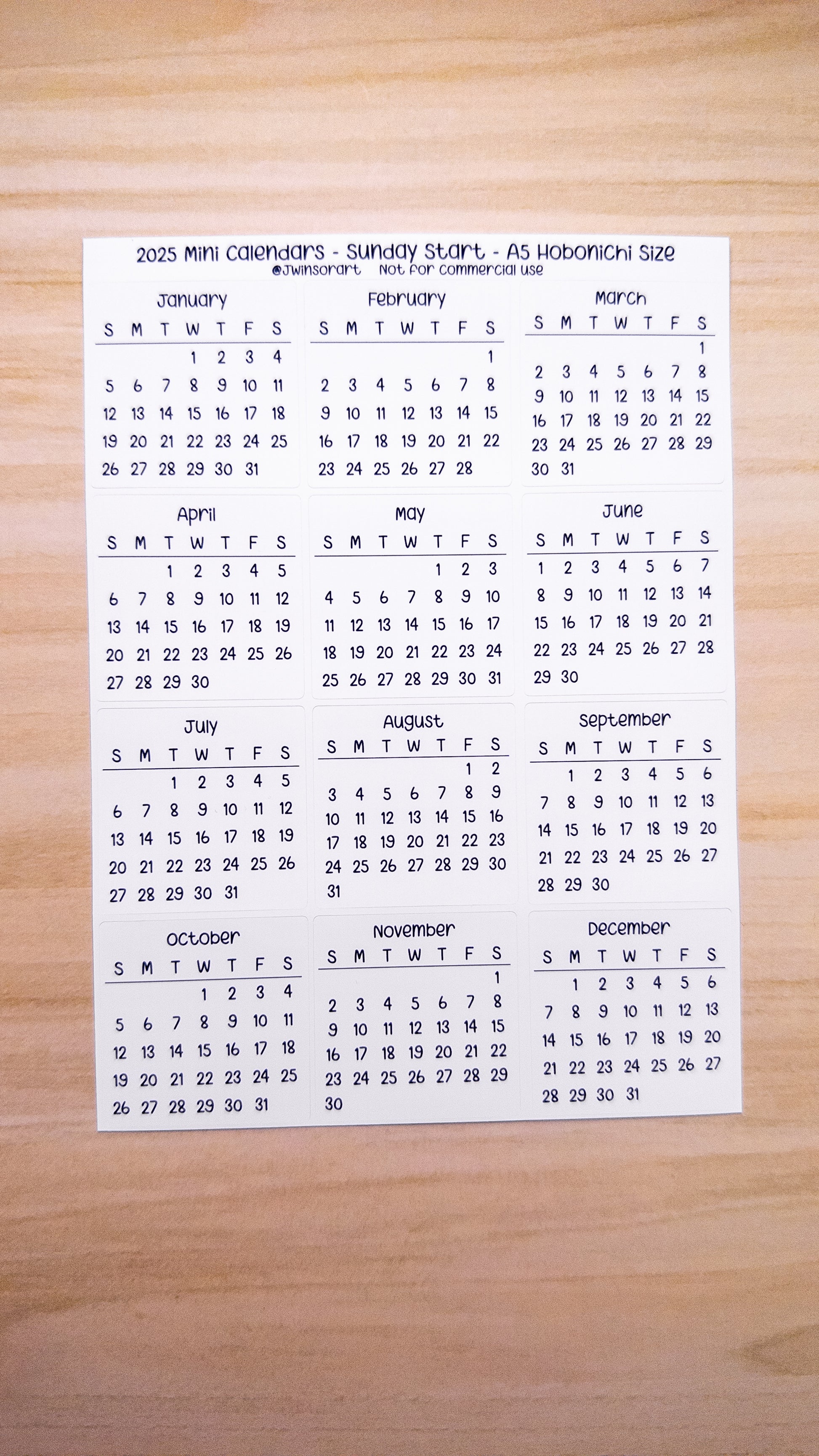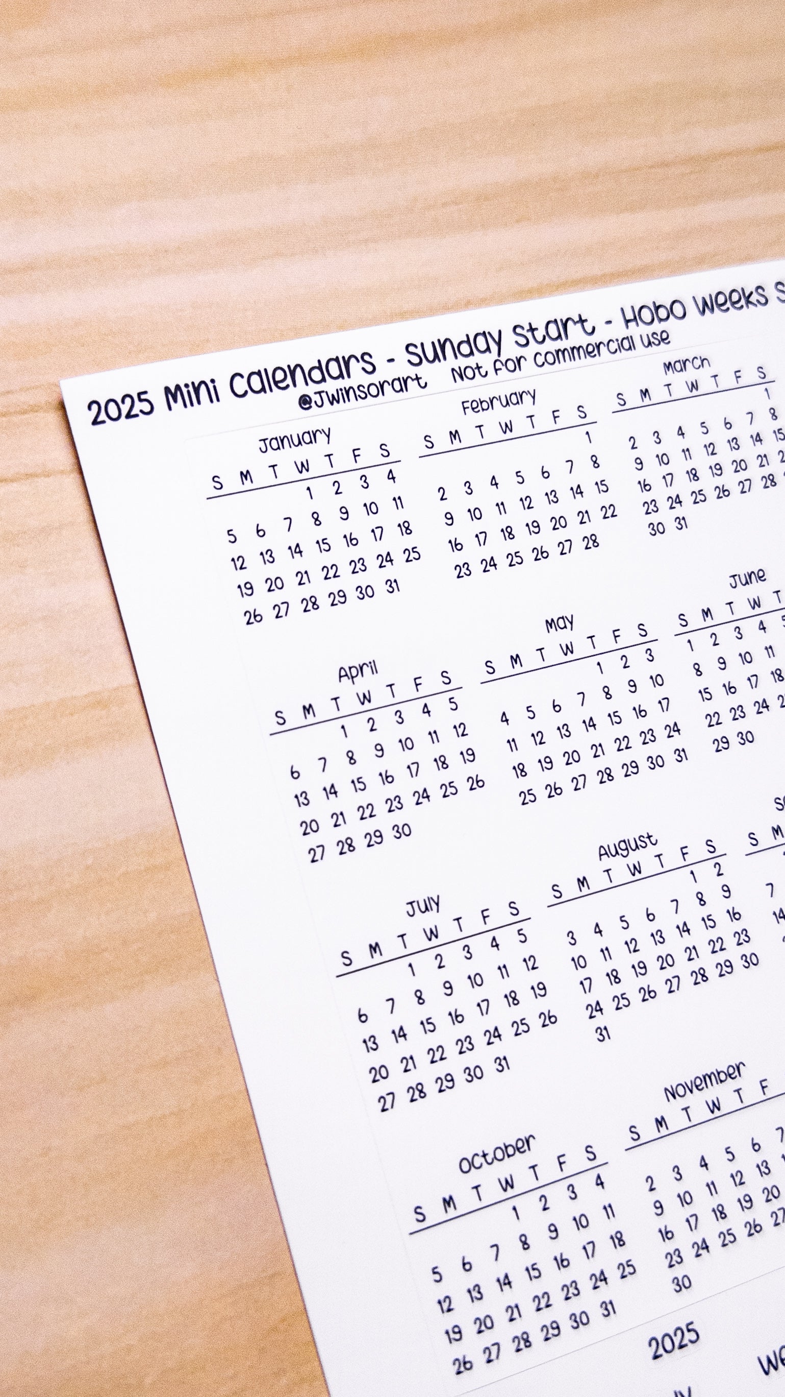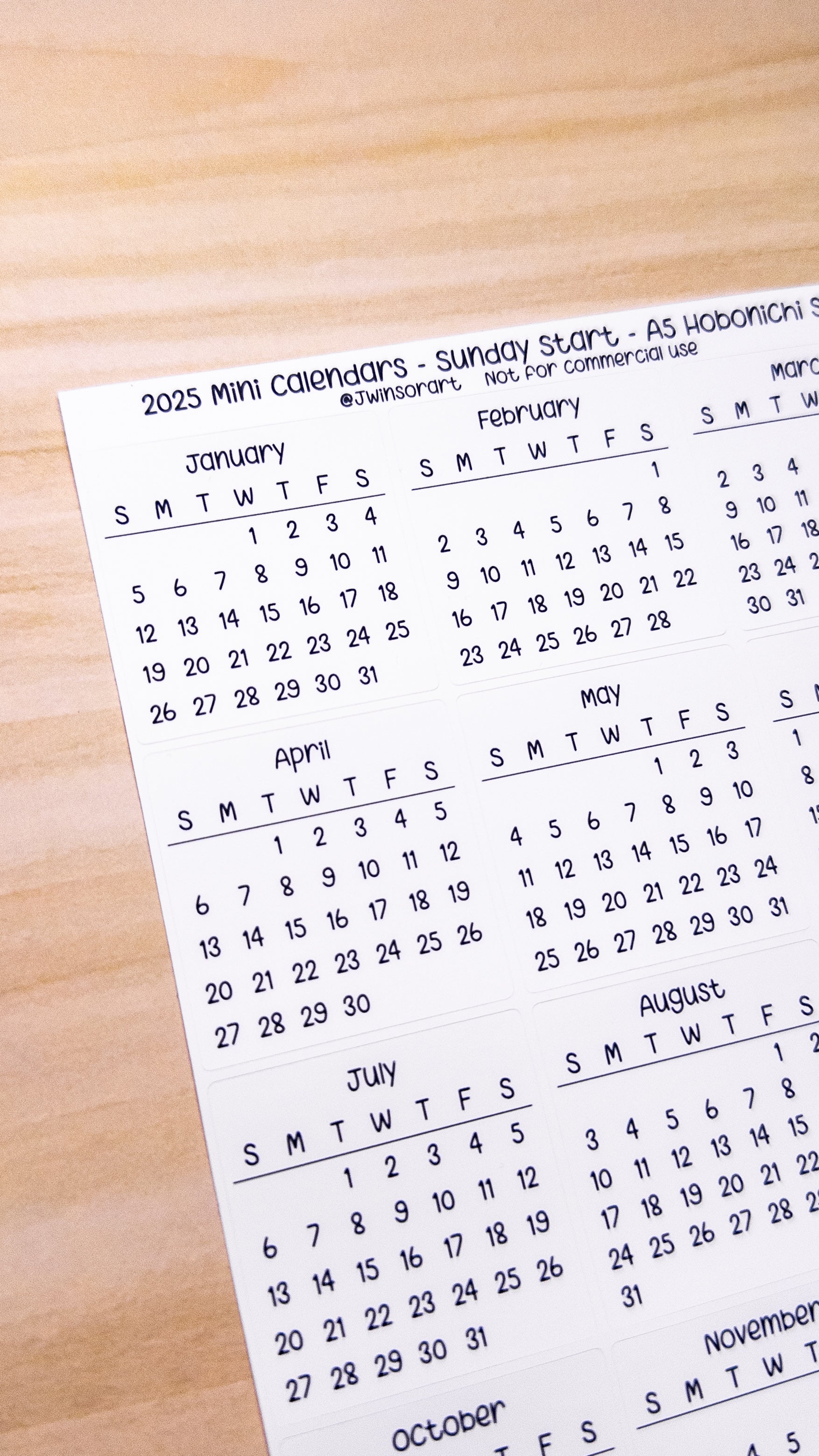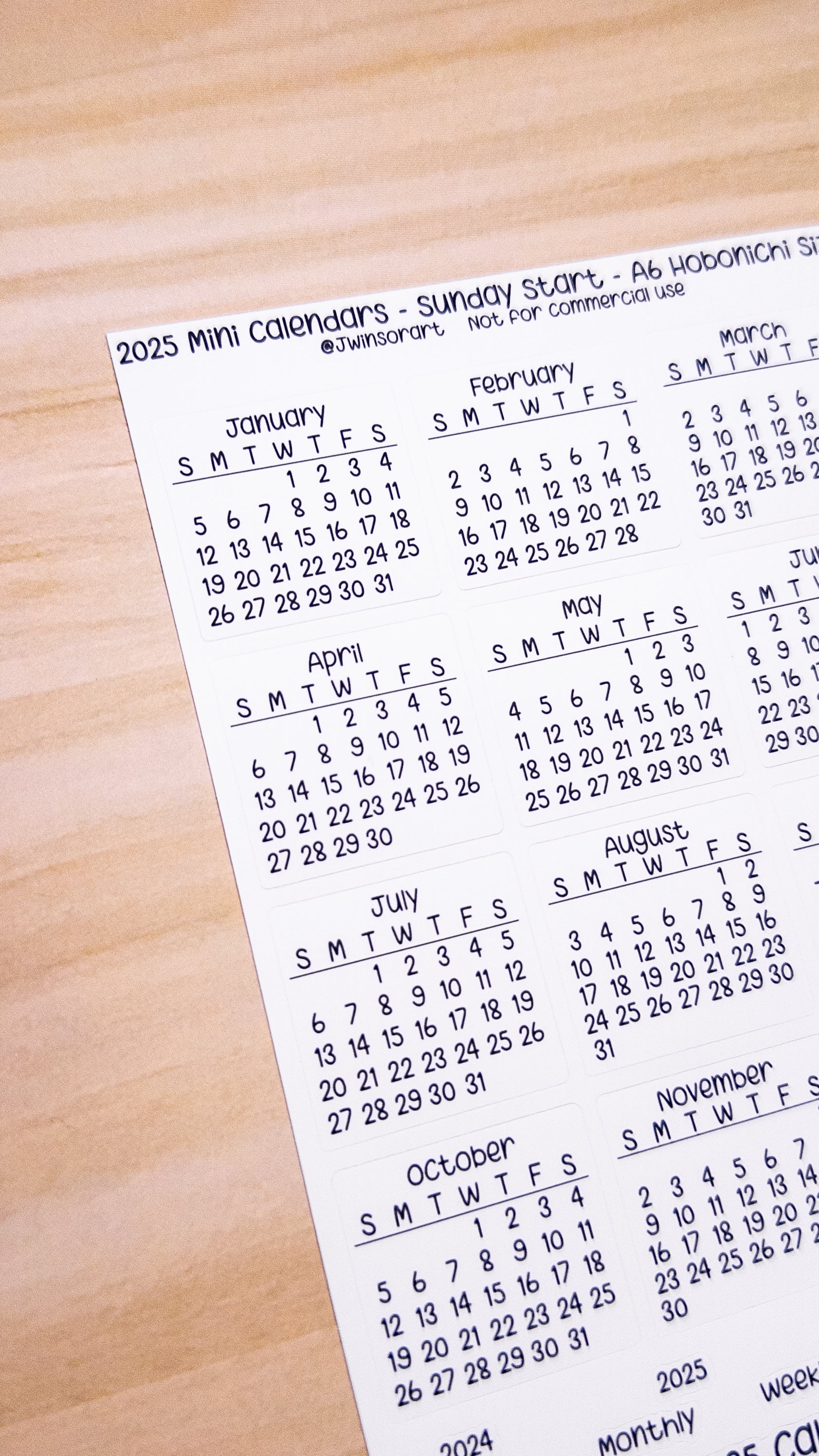 2025 Mini Calendars Hobonichi A5 A6 Weeks Sizes Sunday Start Planner Sticker Sheet Bujo Jan Feb Mar Apr May Jun Jul Aug Sept Oct Nov Dec