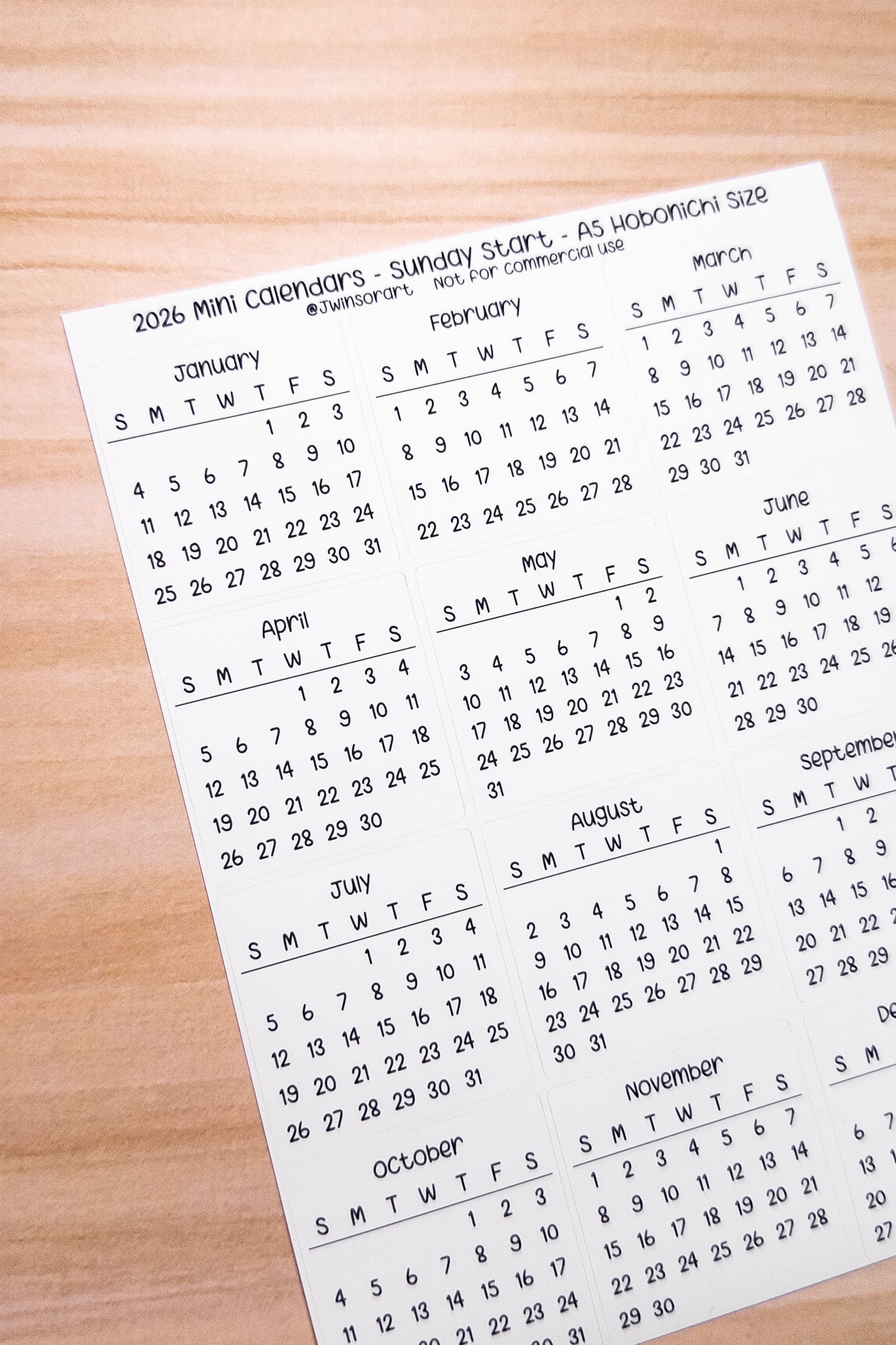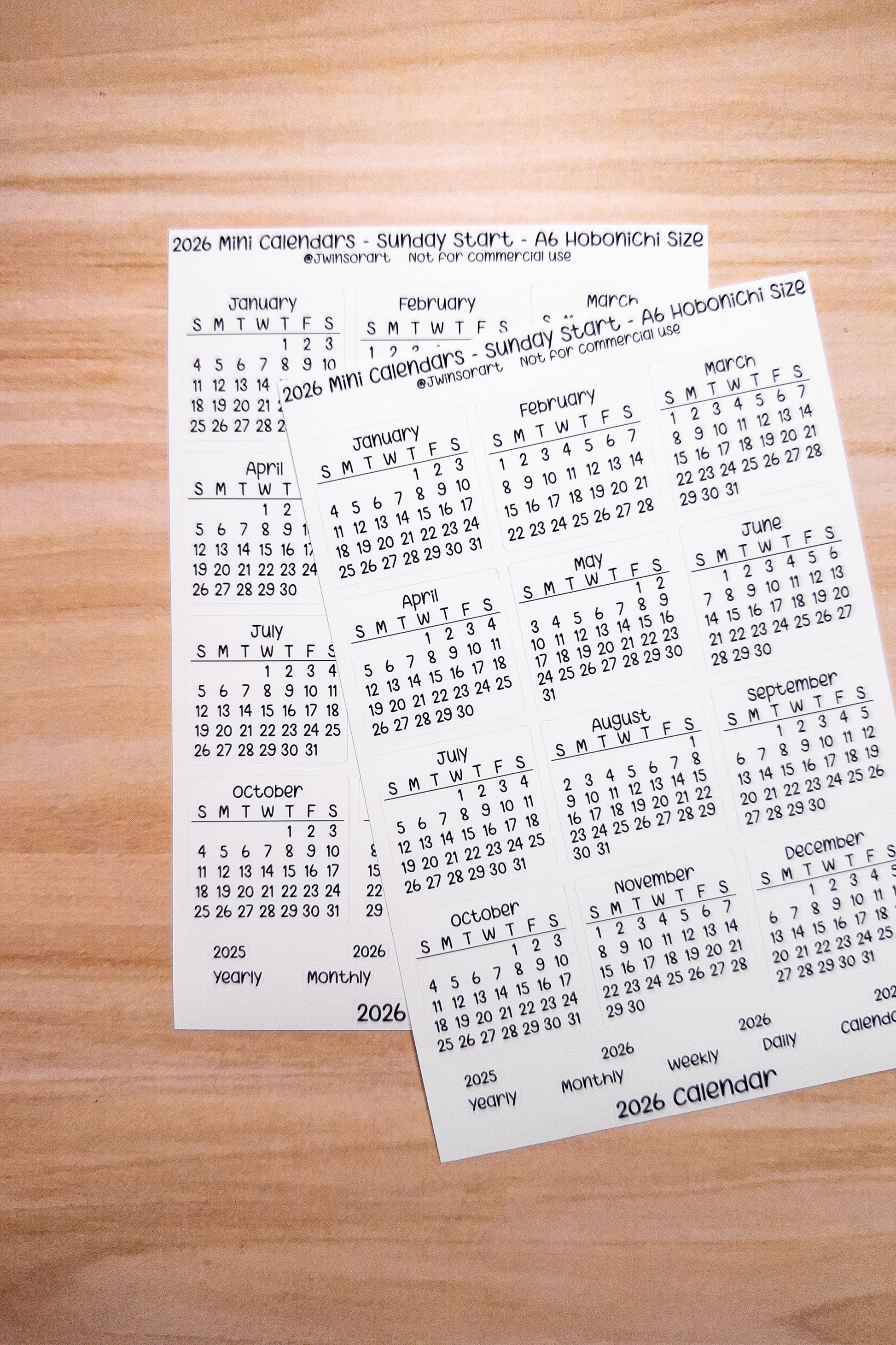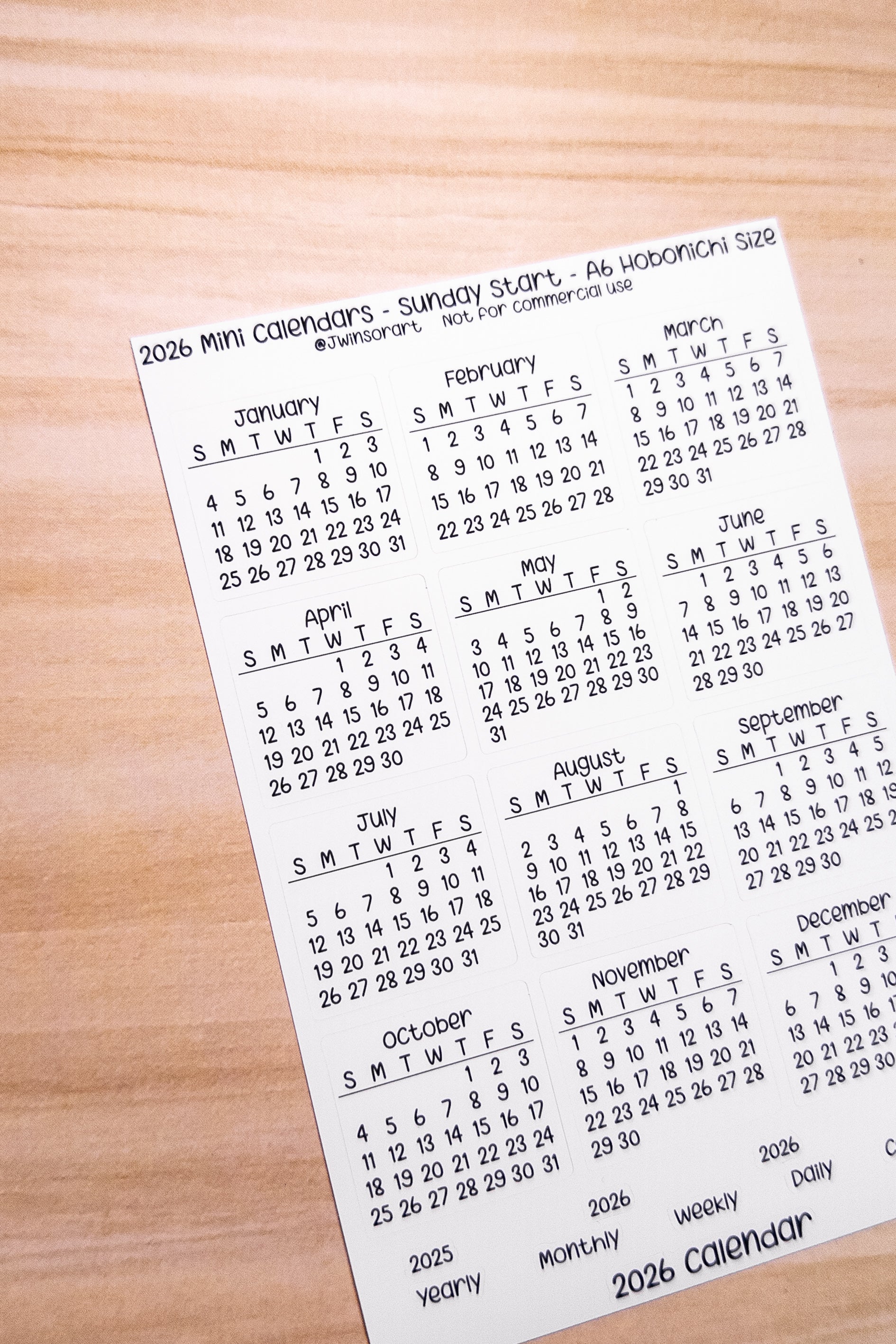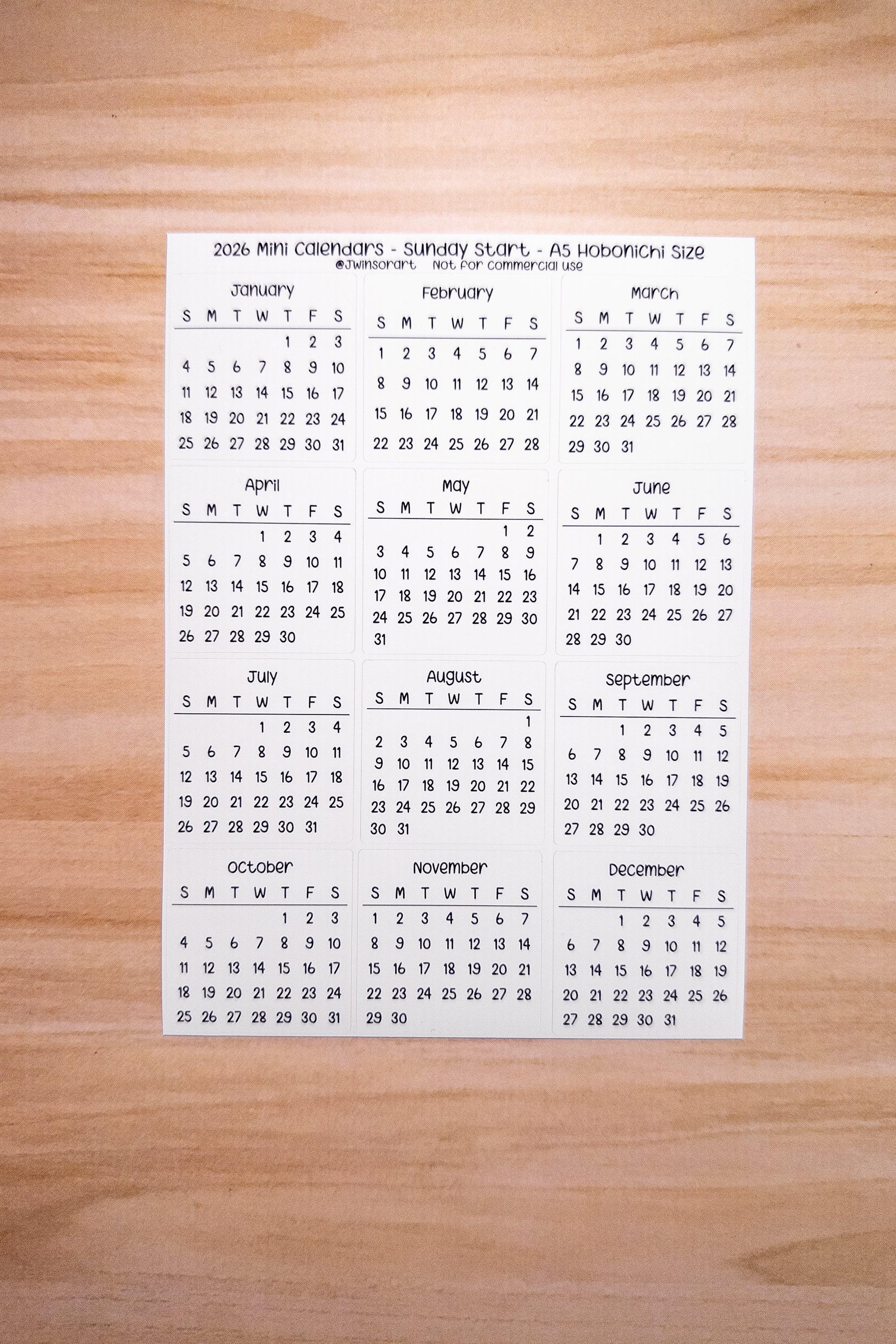 2026 Mini Calendars Hobonichi A5 A6 Weeks Sizes Sunday Start Planner Sticker Sheet Bujo Jan Feb Mar Apr May Jun Jul Aug Sept Oct Nov Dec