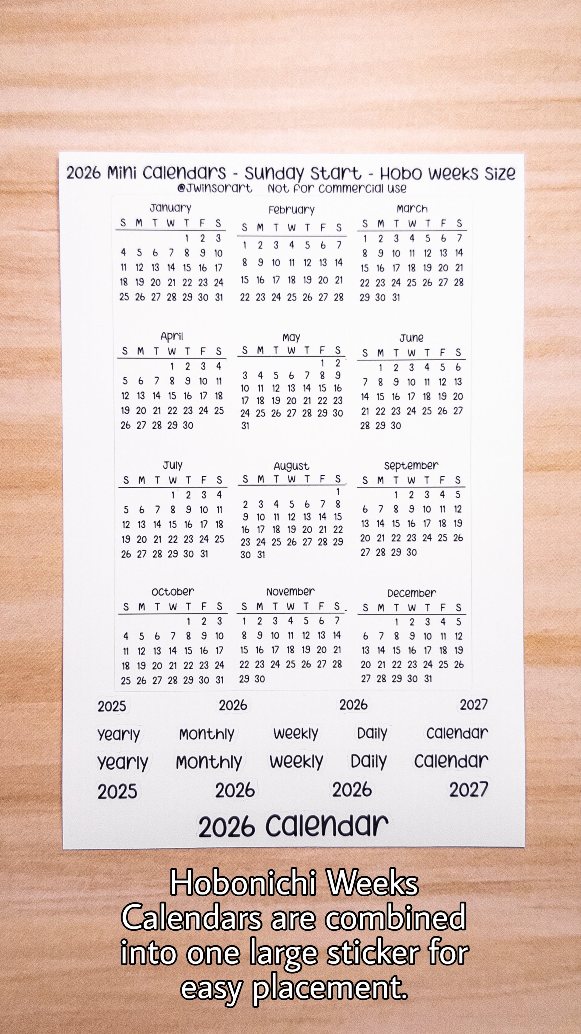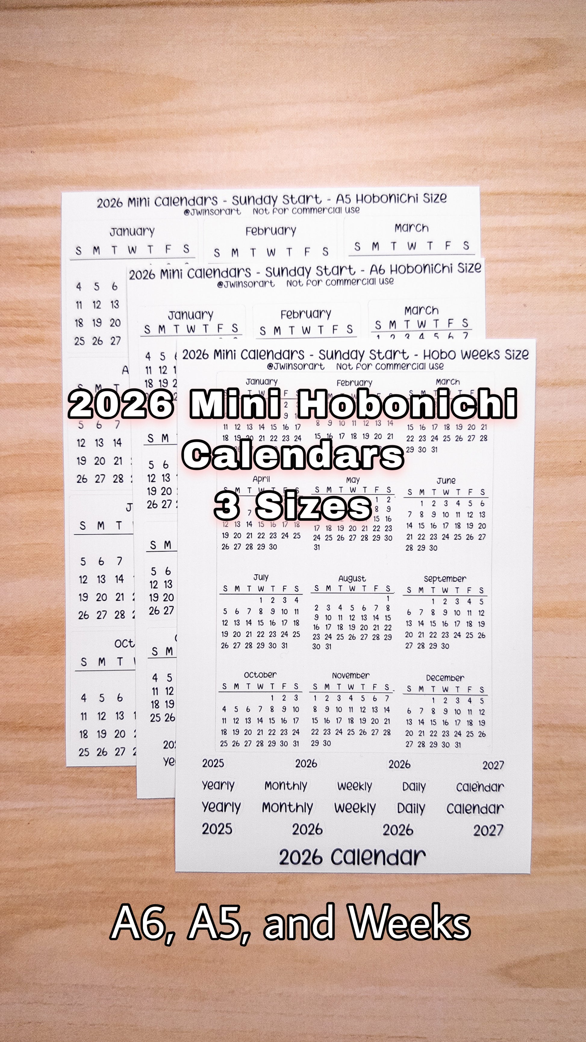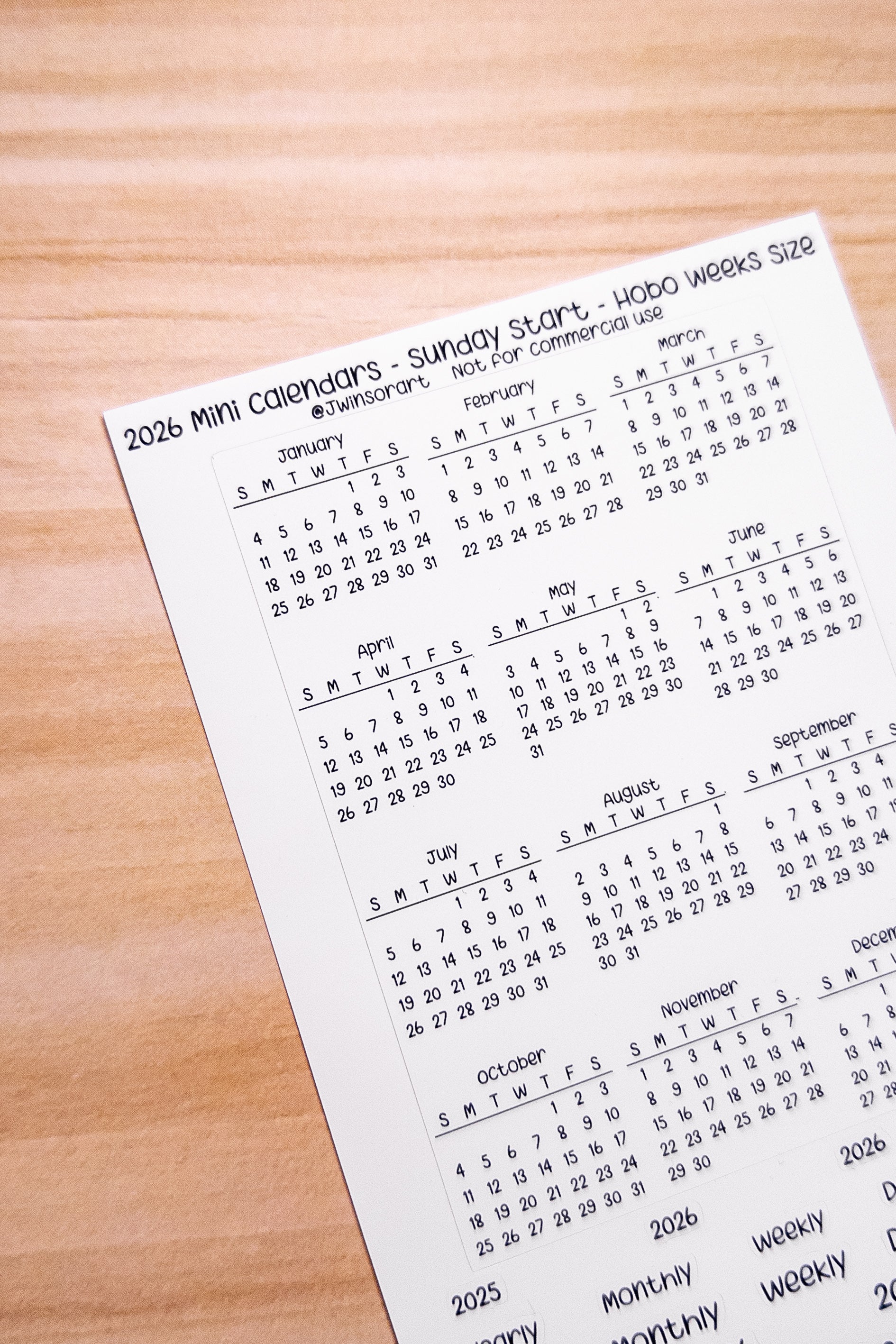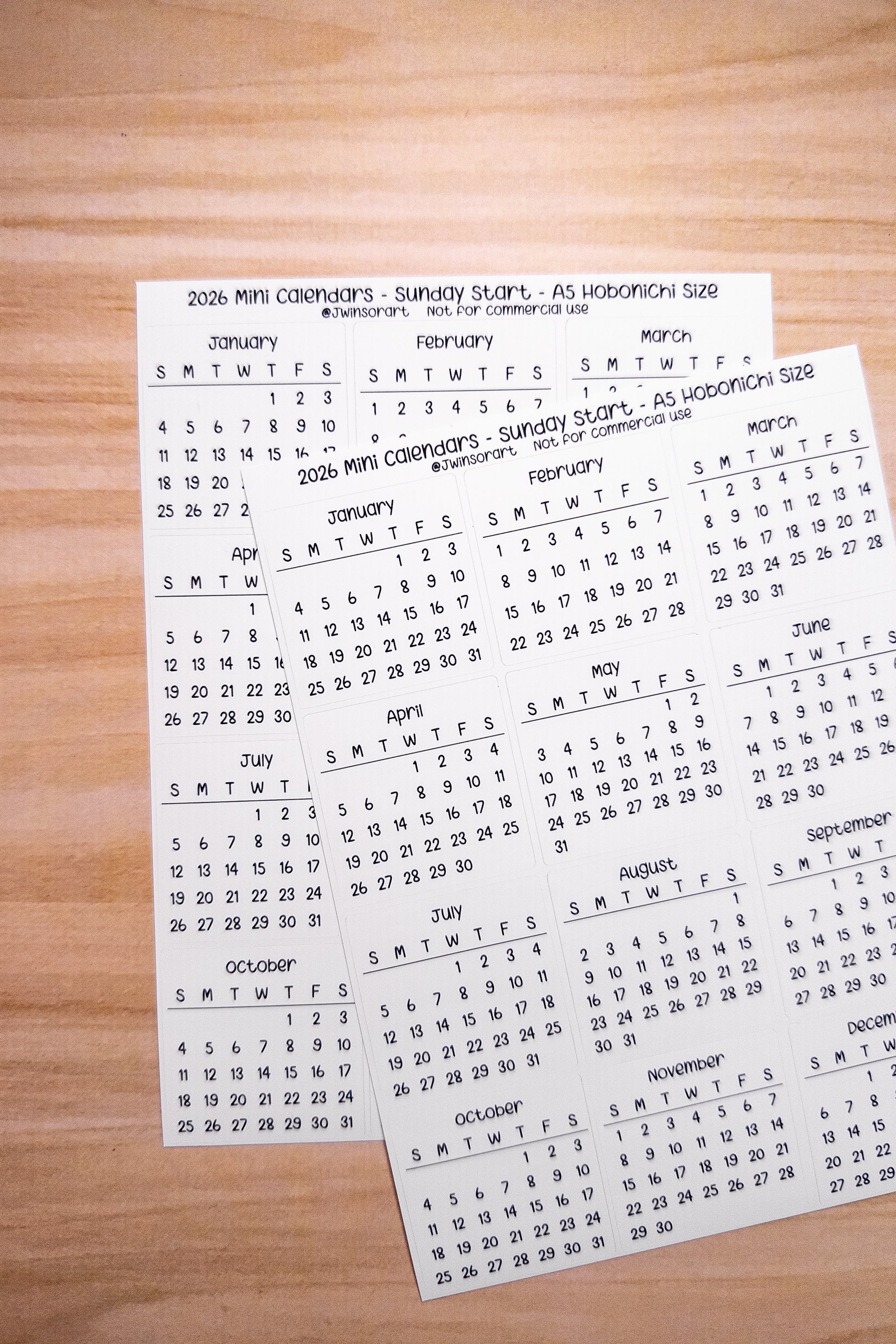 2026 Mini Calendars Hobonichi A5 A6 Weeks Sizes Sunday Start Planner Sticker Sheet Bujo Jan Feb Mar Apr May Jun Jul Aug Sept Oct Nov Dec