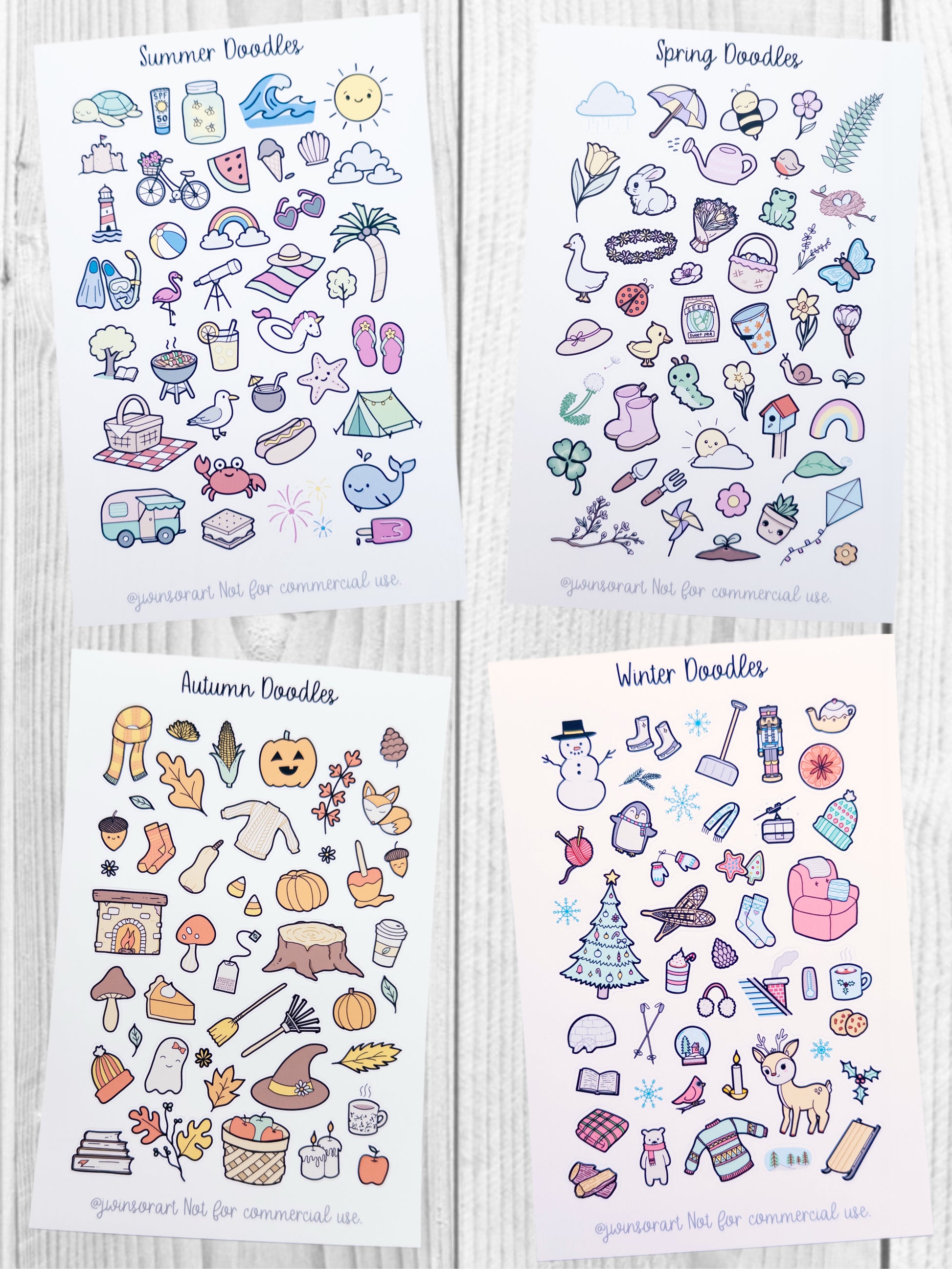 This set includes four full sticker sheets—Spring, Summer, Autumn, and Winter—each filled with hand-drawn doodles that capture the cozy, joyful, and whimsical moments of the year.