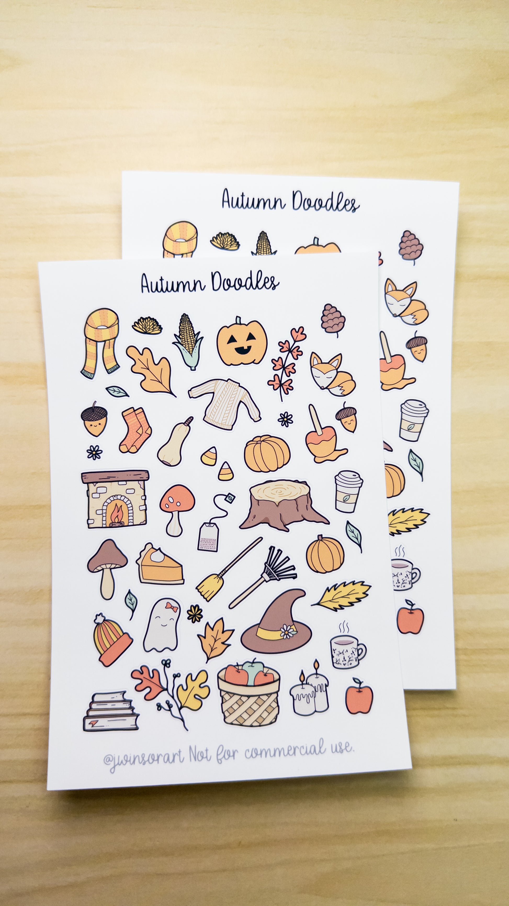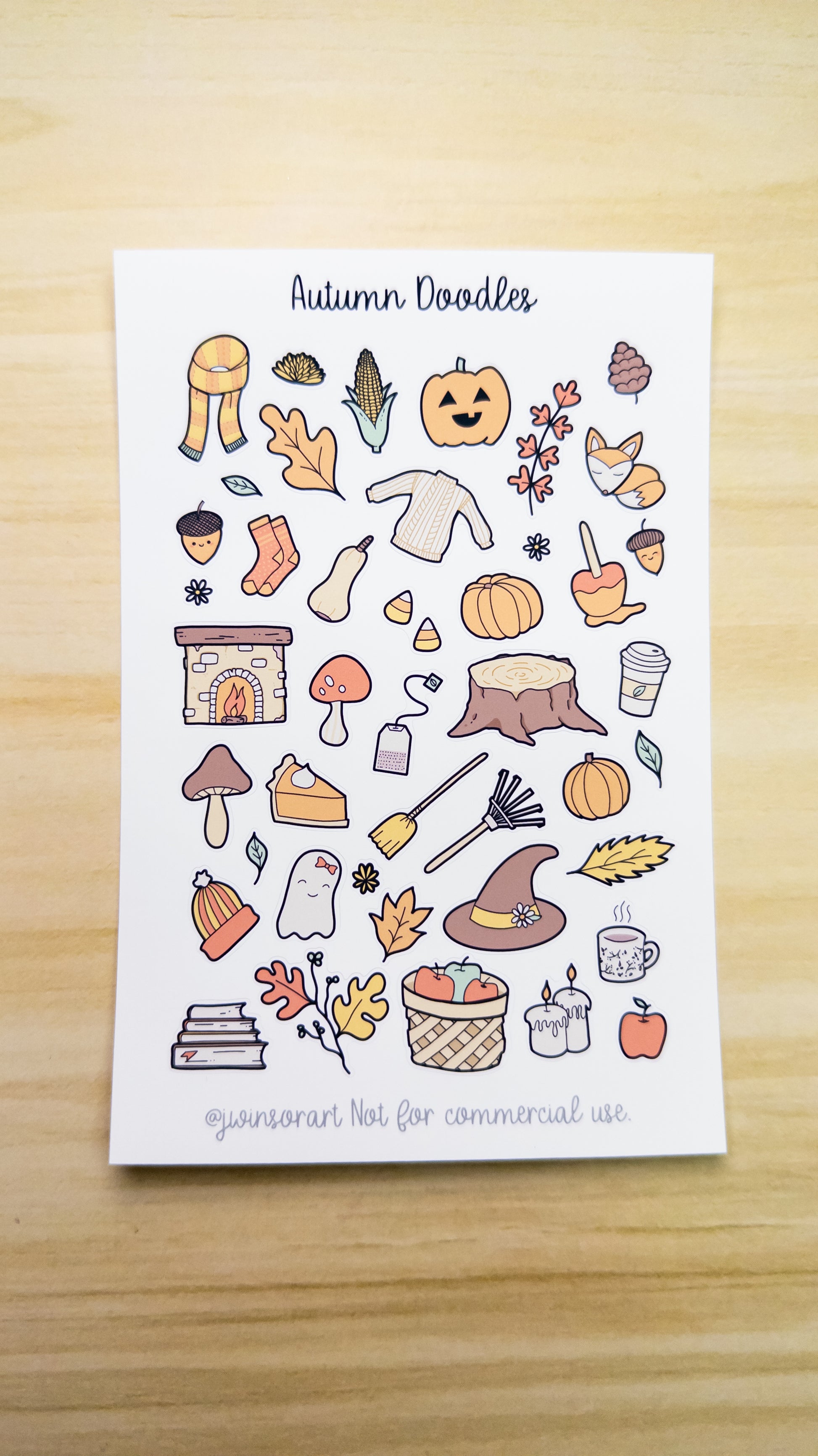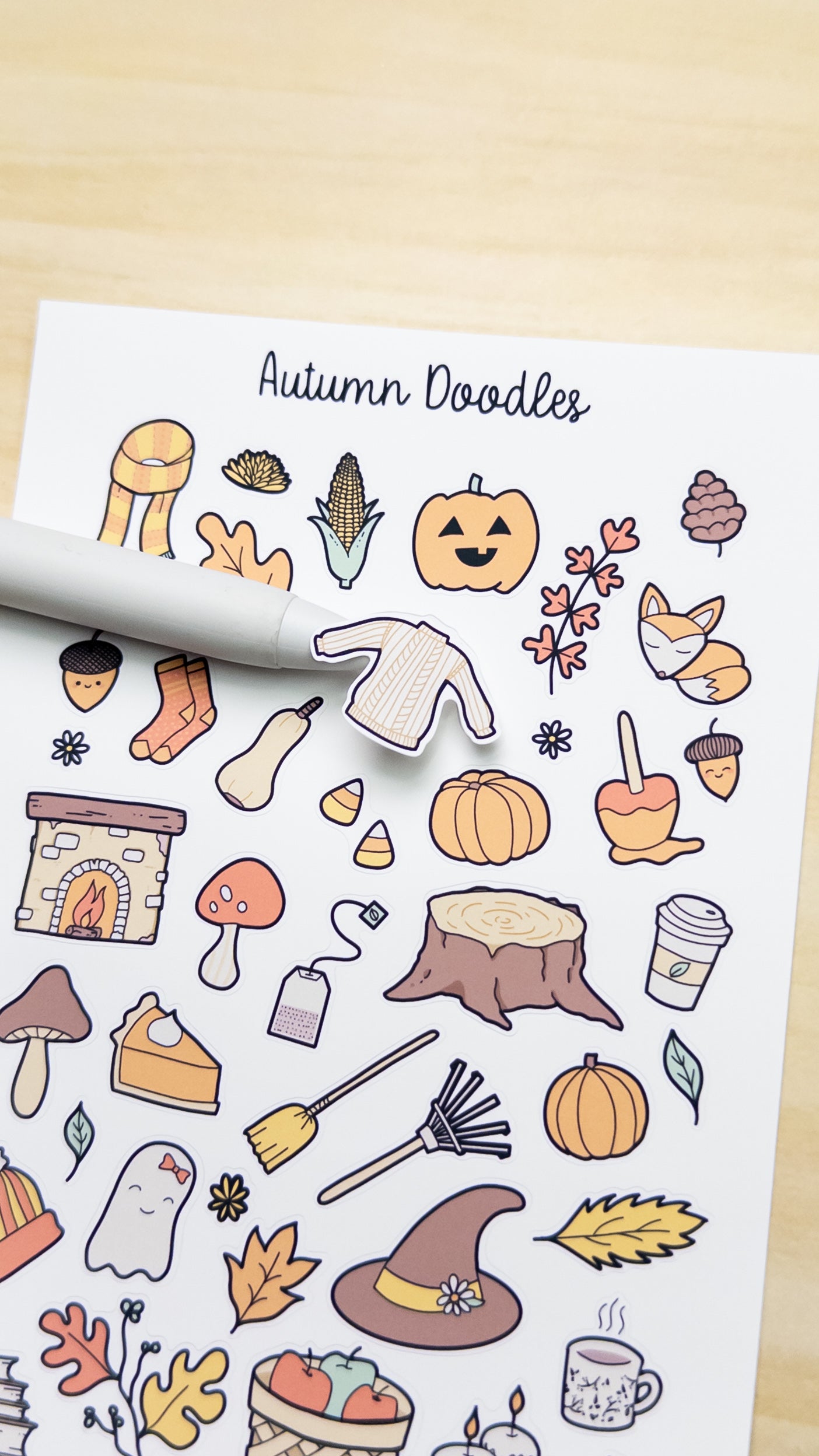 Autumn Doodles Deco Planner Sticker Sheet Fall Pumpkin Leaves Corn Apples Mushroom Bujo Cute Kawaii