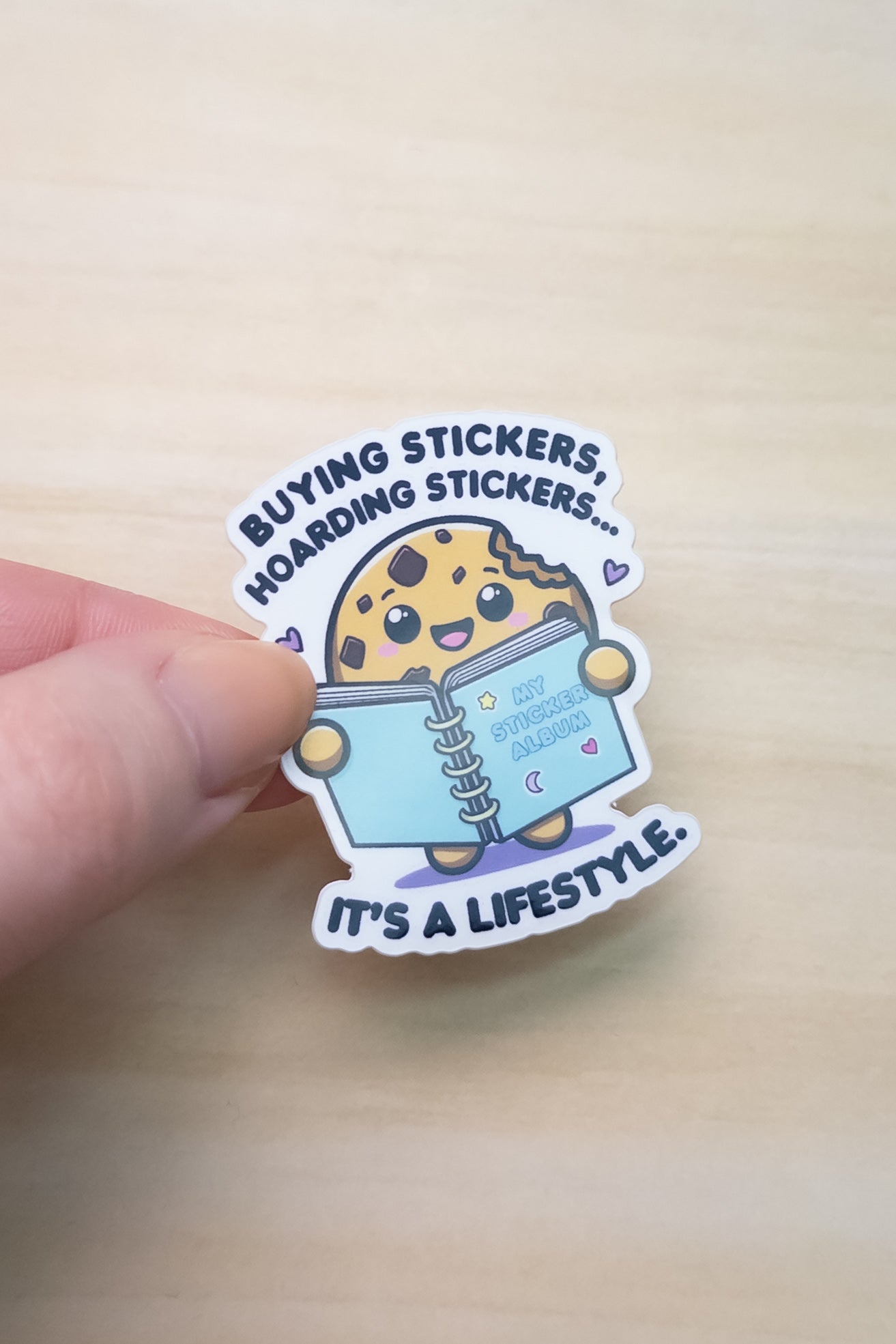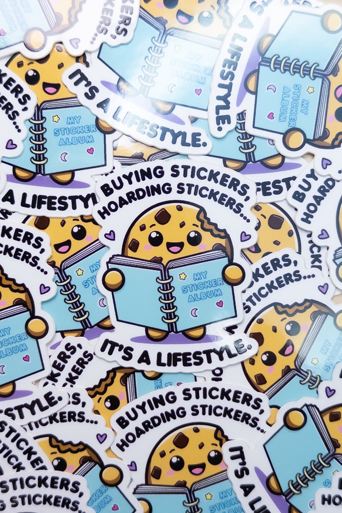 This listing is for one vinyl sticker that reads, "Buying stickers, hoarding stickers... it's a lifestyle." Perfect for planner lovers, sticker collectors, and stationery addicts, this cute die-cut decal features my cookie mascot holding a sticker album. It’s a great gift for sticker lovers, journaling enthusiasts, and anyone who loves decorating their planner, journal, or scrapbook.