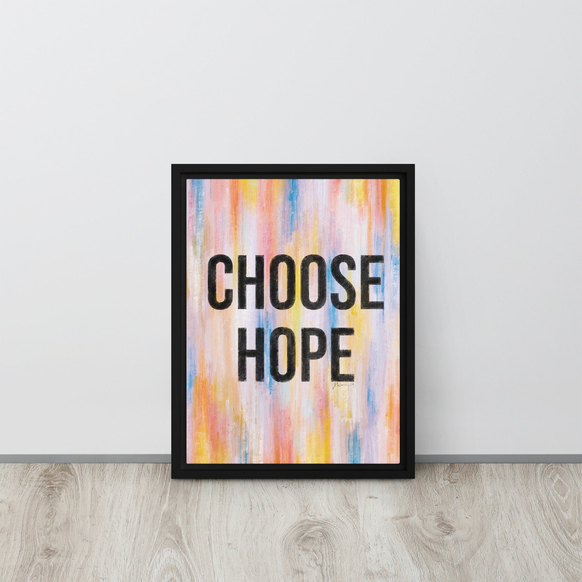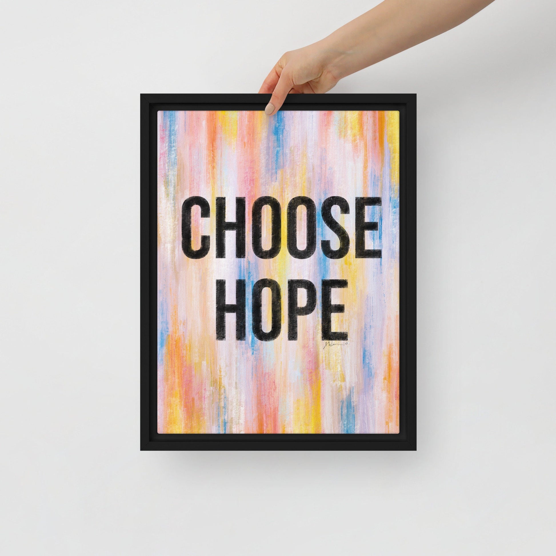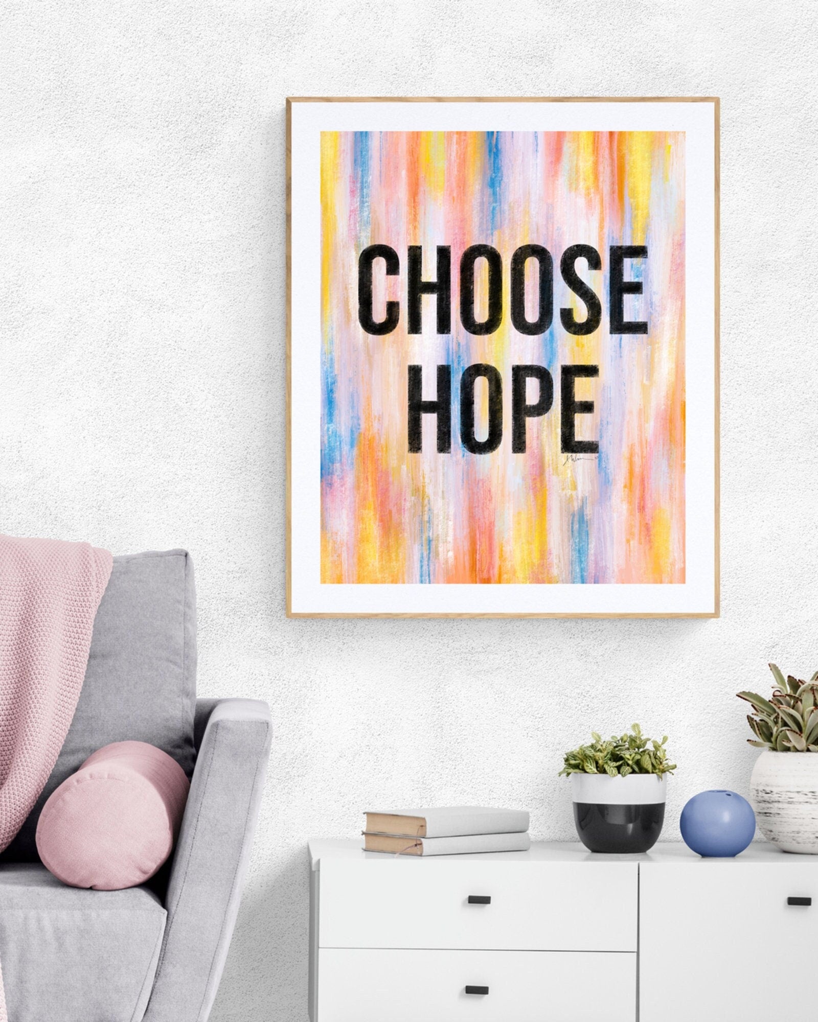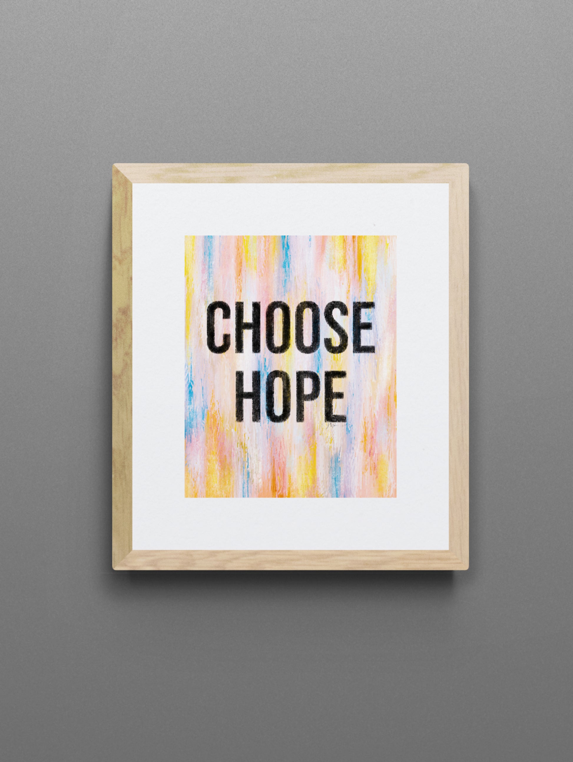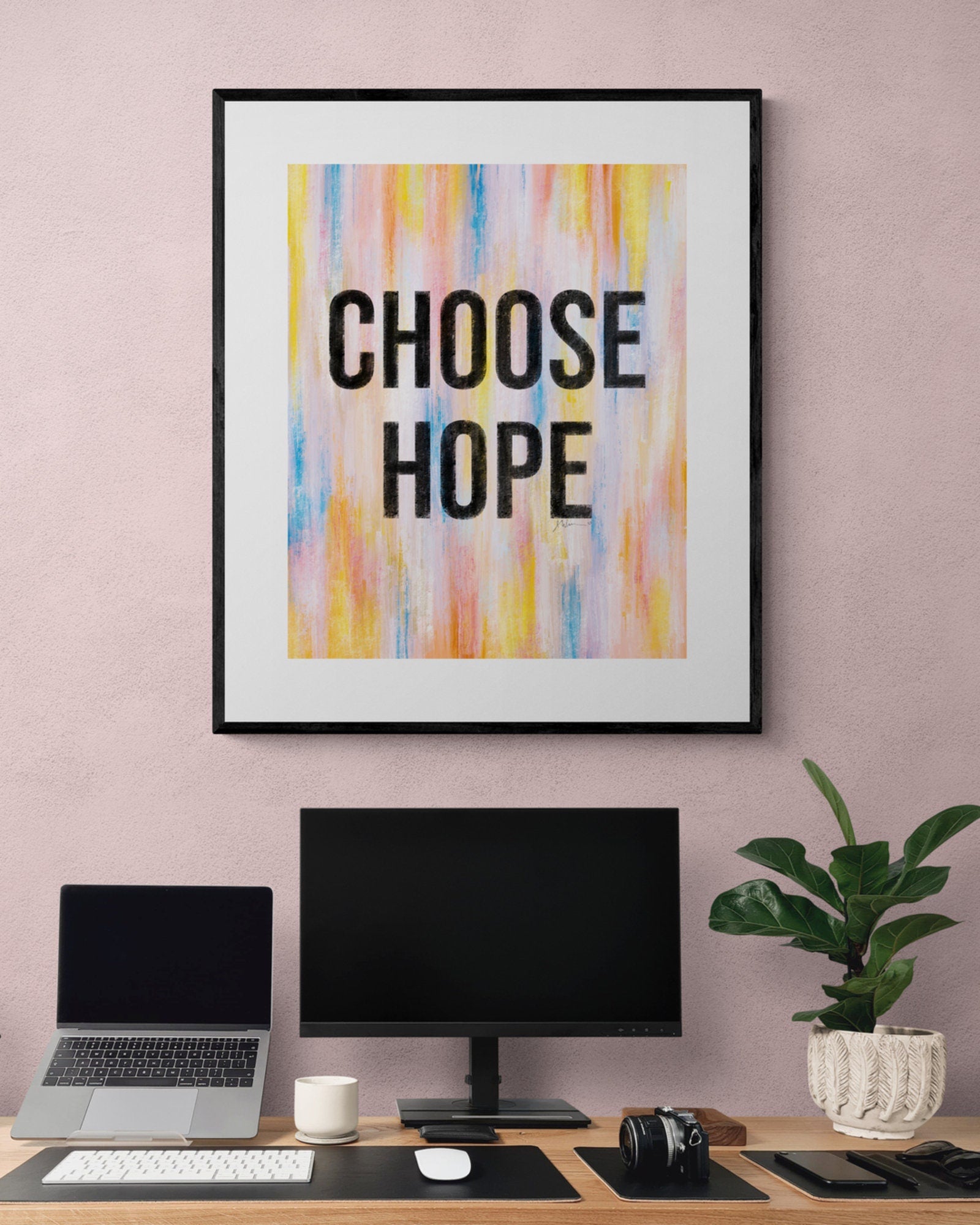 This listing is for a Giclée print of a digital piece of art. Bold text reads “CHOOSE HOPE” on a colorful abstract background. Print only. NO FRAME INCLUDED. Images with matting and framing are provided to help imagine how the piece might look in your space. The actual print you will receive is 8 inches by 10 inches and printed without a border.
