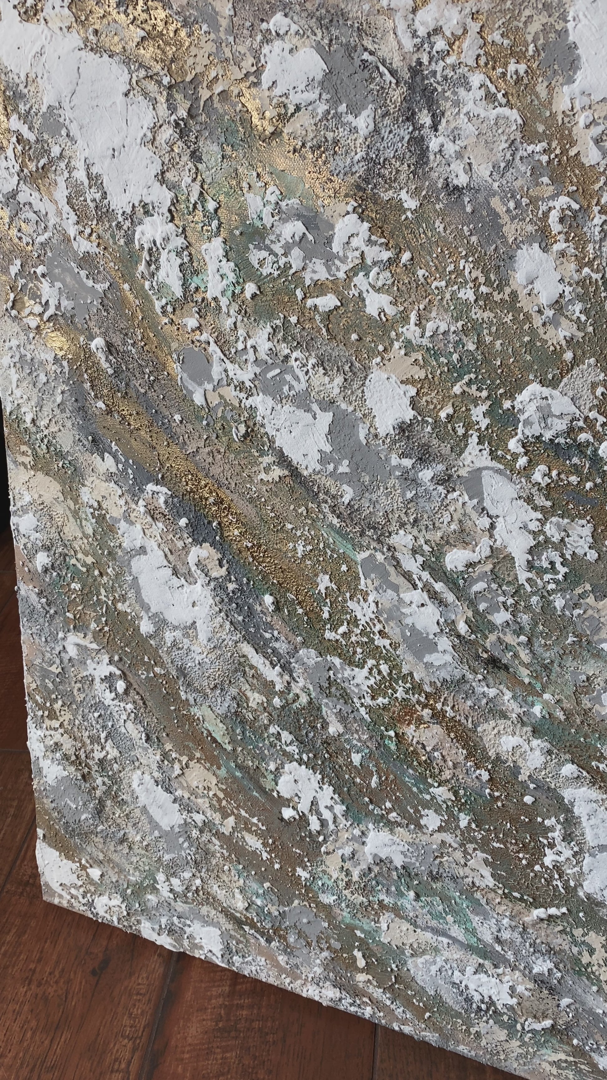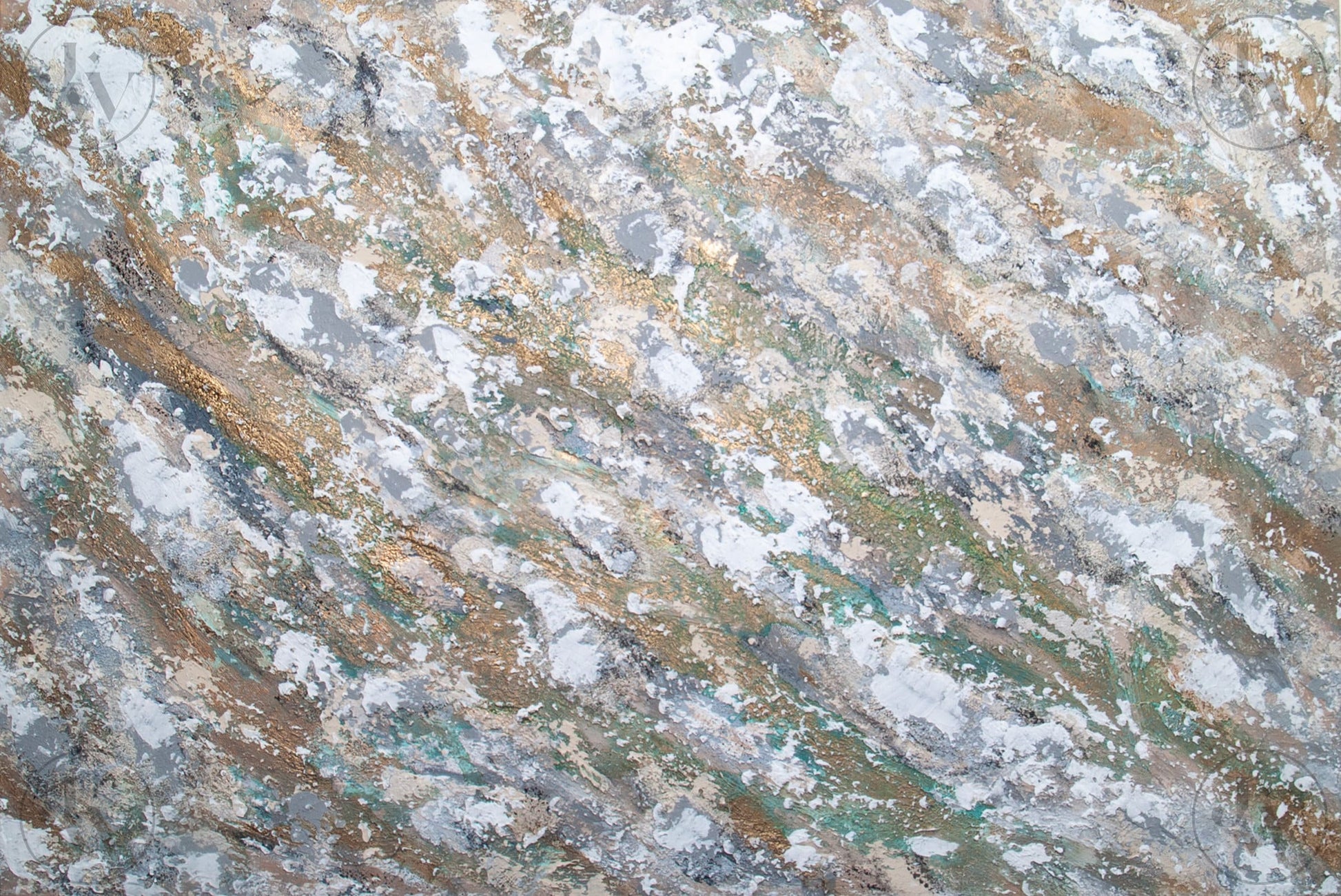 This listing is for an original painting on canvas titled "Downstream". This is a textured abstract painting done with acrylics and mixed media. There is a bronze metallic layer as well as grey, white, and tan layers. You will notice spots of turquoise green throughout. Painting measures 36 inches by 24 inches.