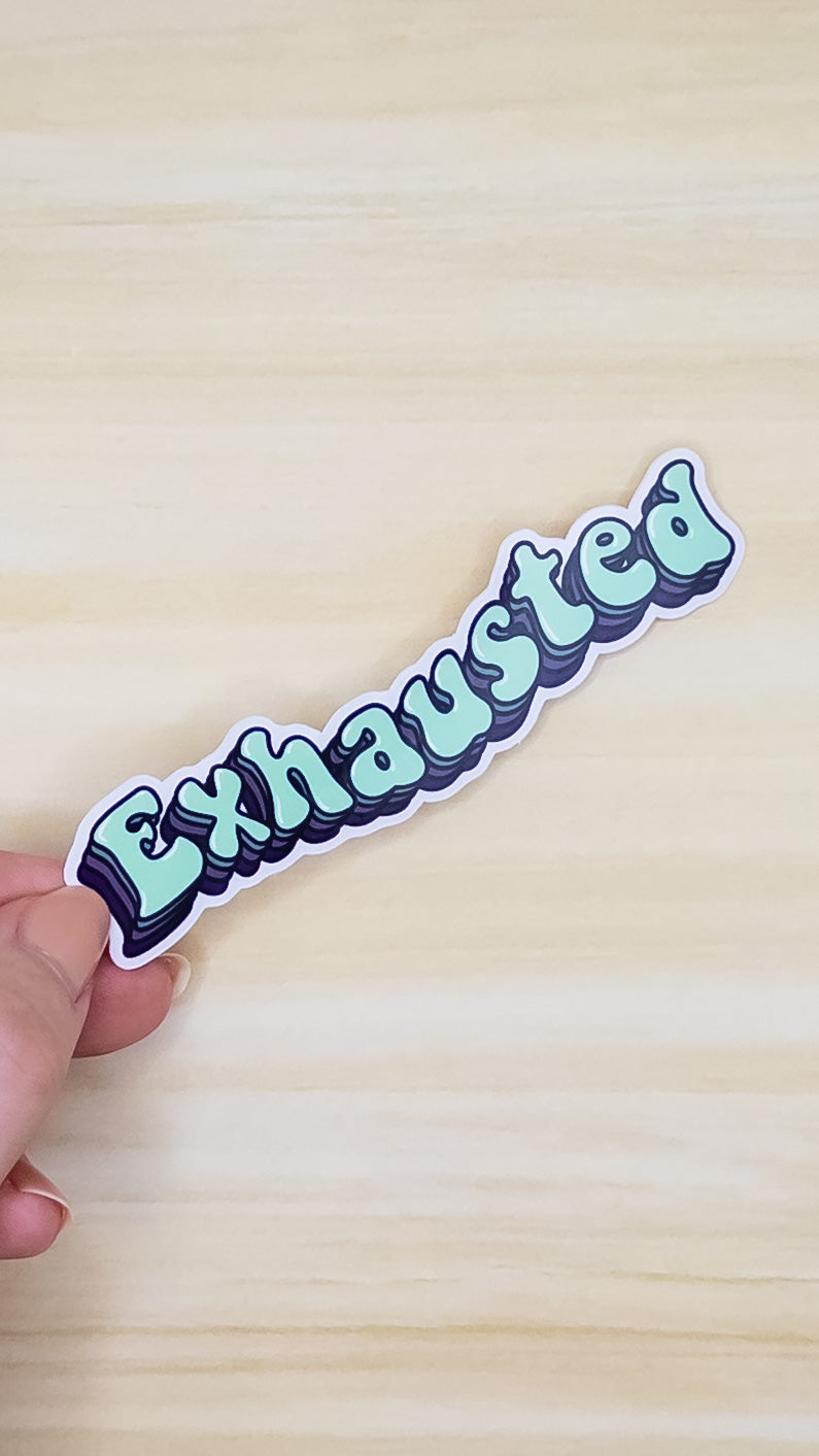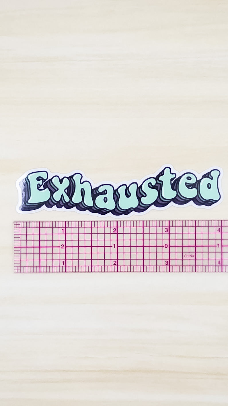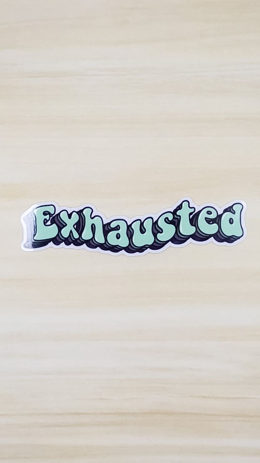 This listing is for one vinyl sticker that tells the world you're "exhausted" in a fun retro font. The vinyl sticker measures 4 inches by 1 inch. Sticker is weather proof and has a glossy finish.