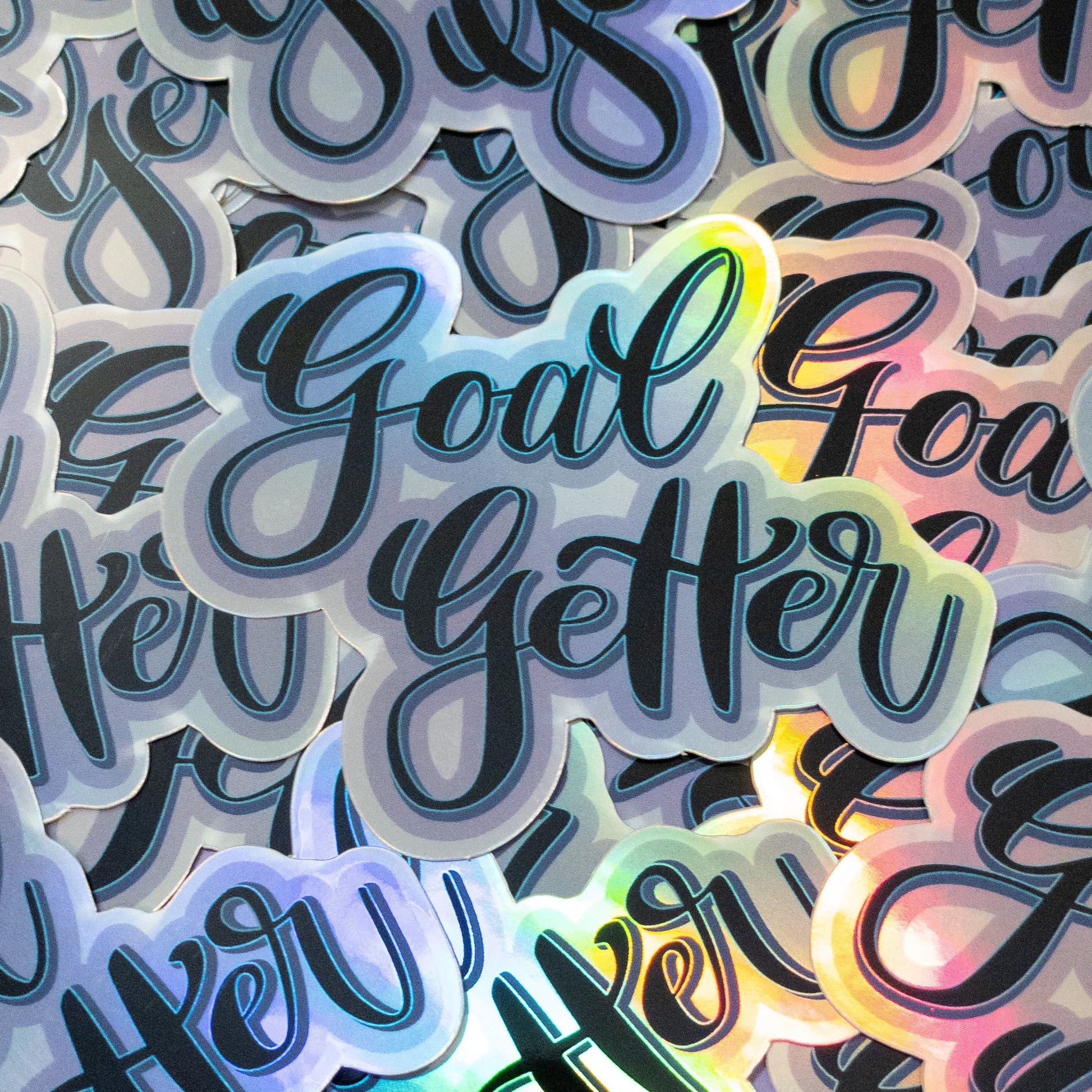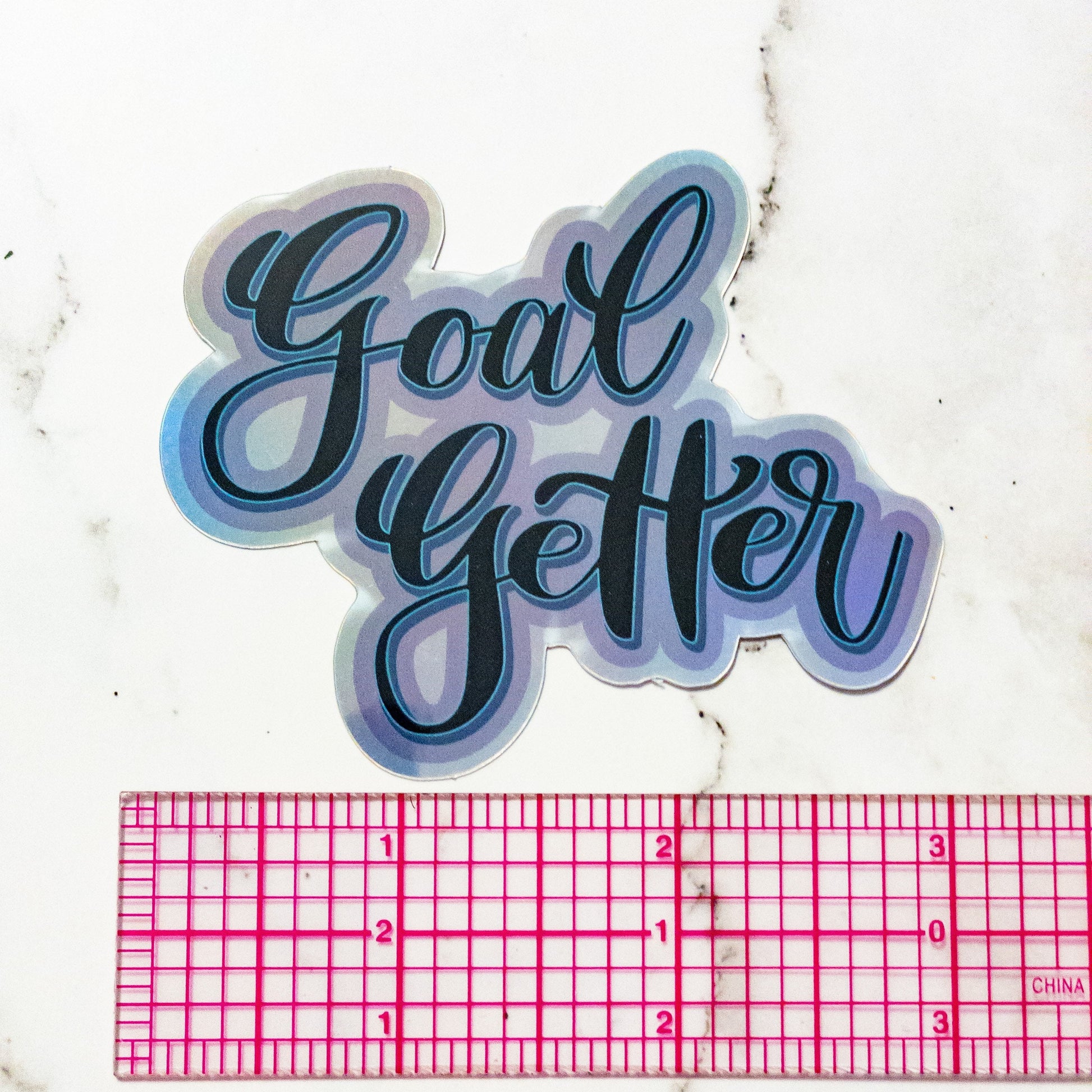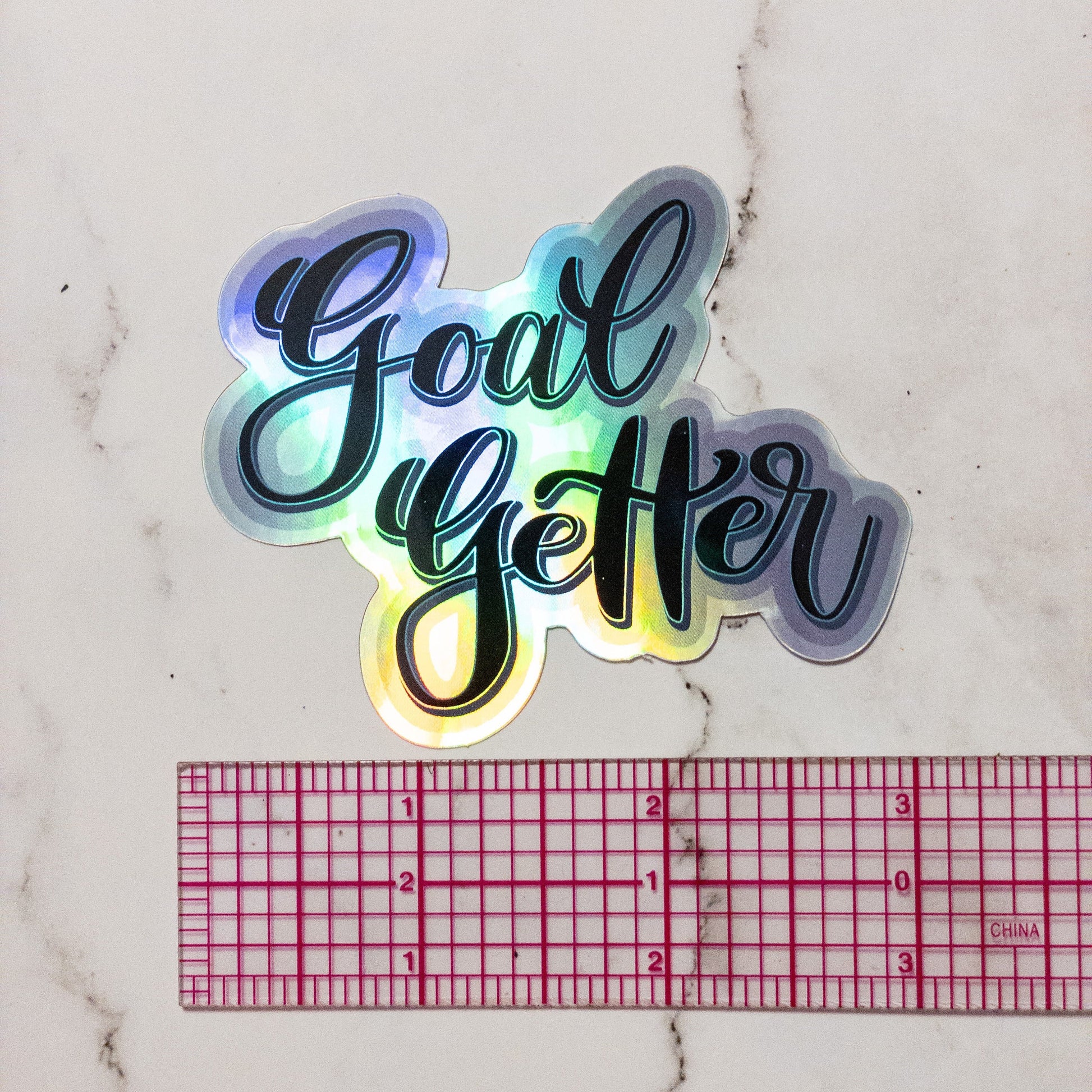 This listing is for one holographic sticker with the words "goal getter". The holographic sticker measures 2.9 inches by 2.3 inches. Sticker is weather proof and has a satin/glossy finish.