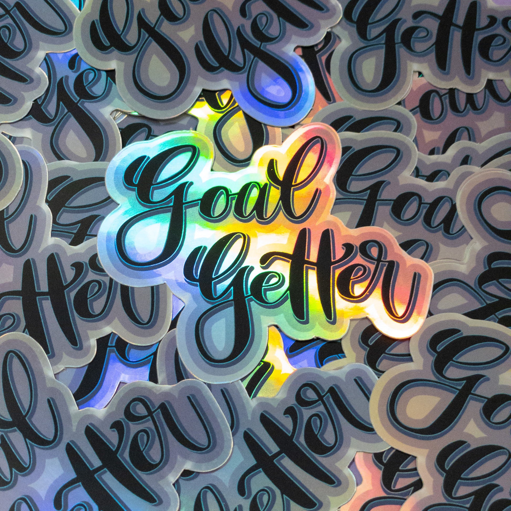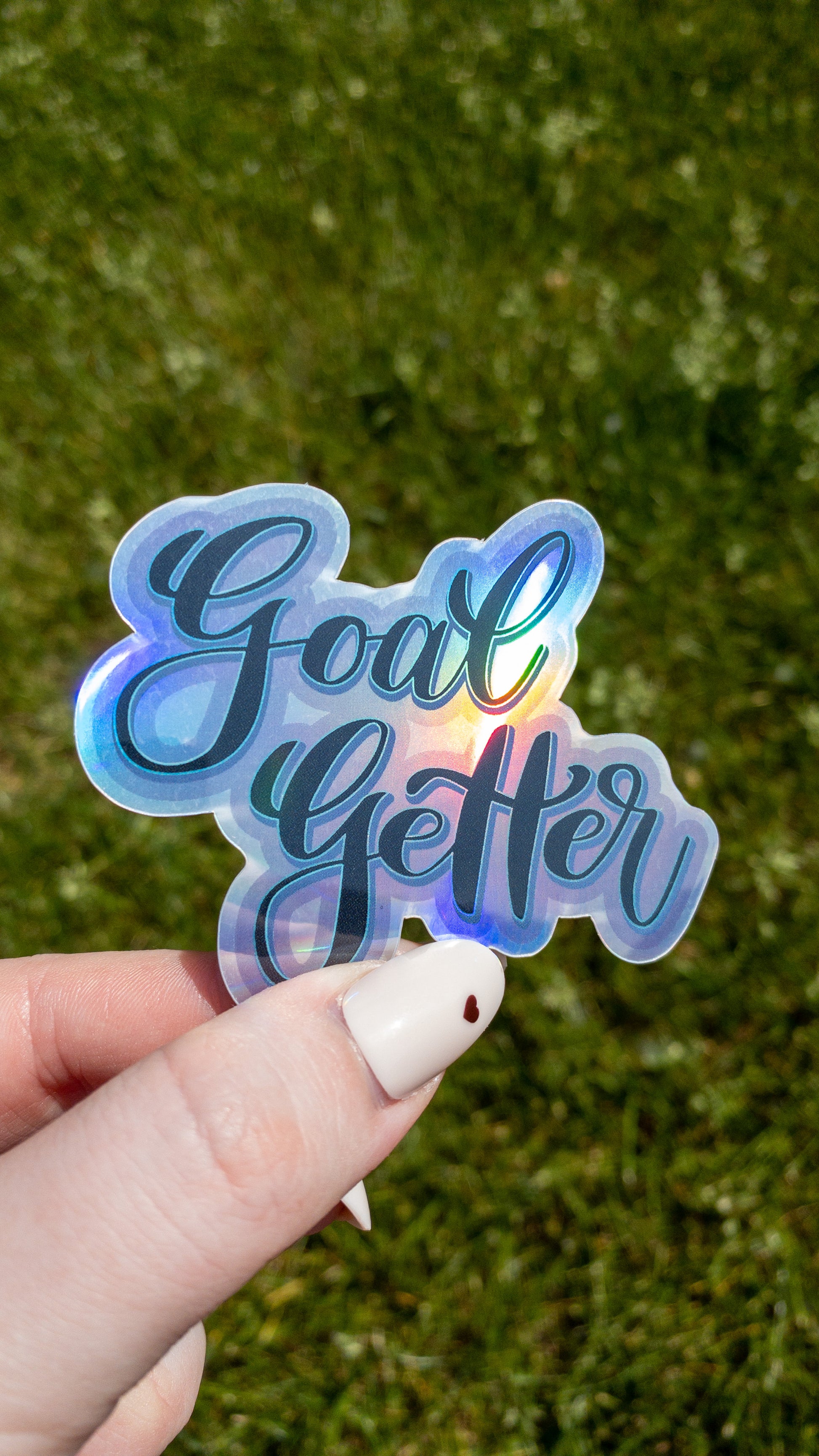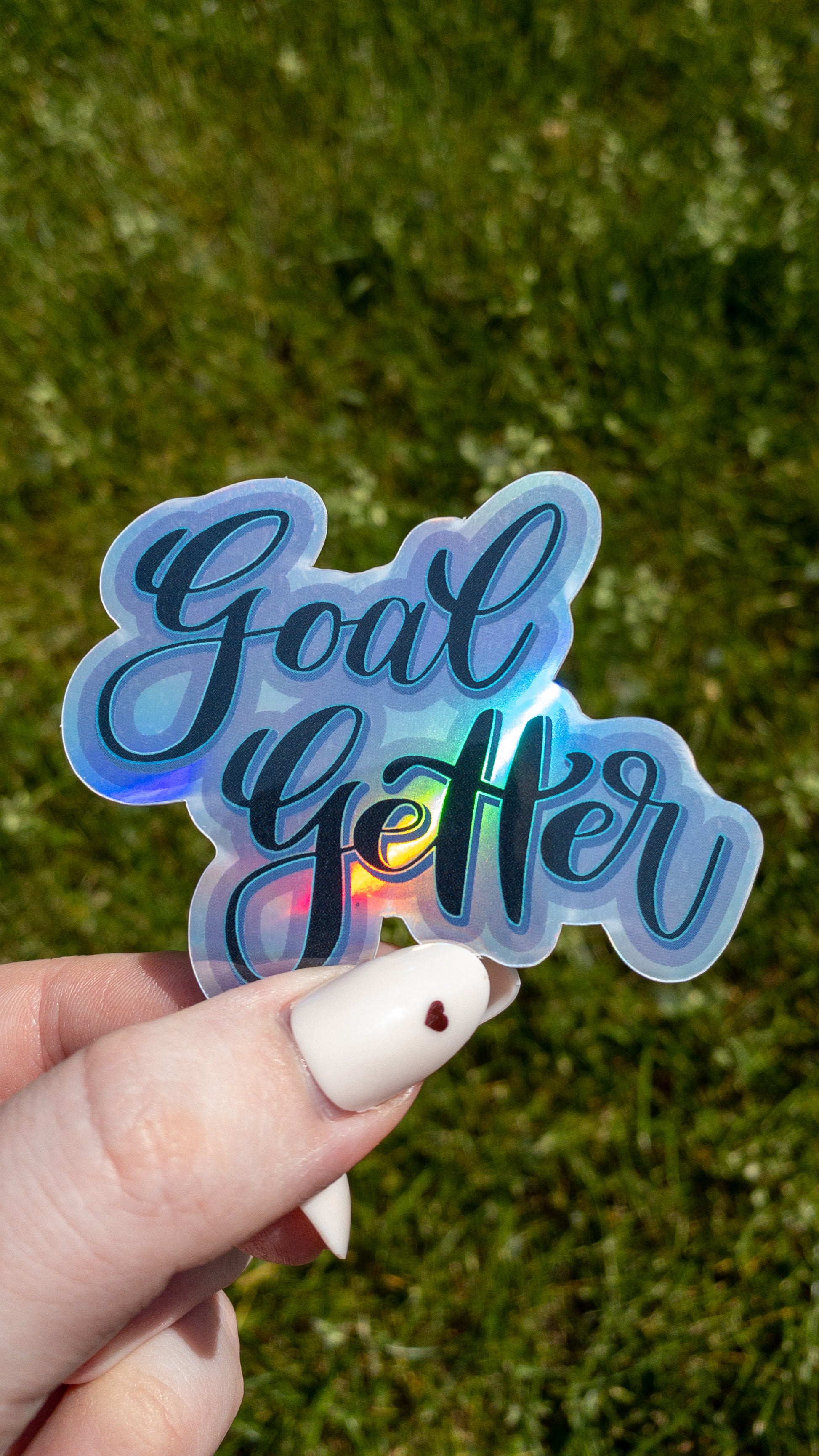 This listing is for one holographic sticker with the words "goal getter". The holographic sticker measures 2.9 inches by 2.3 inches. Sticker is weather proof and has a satin/glossy finish.