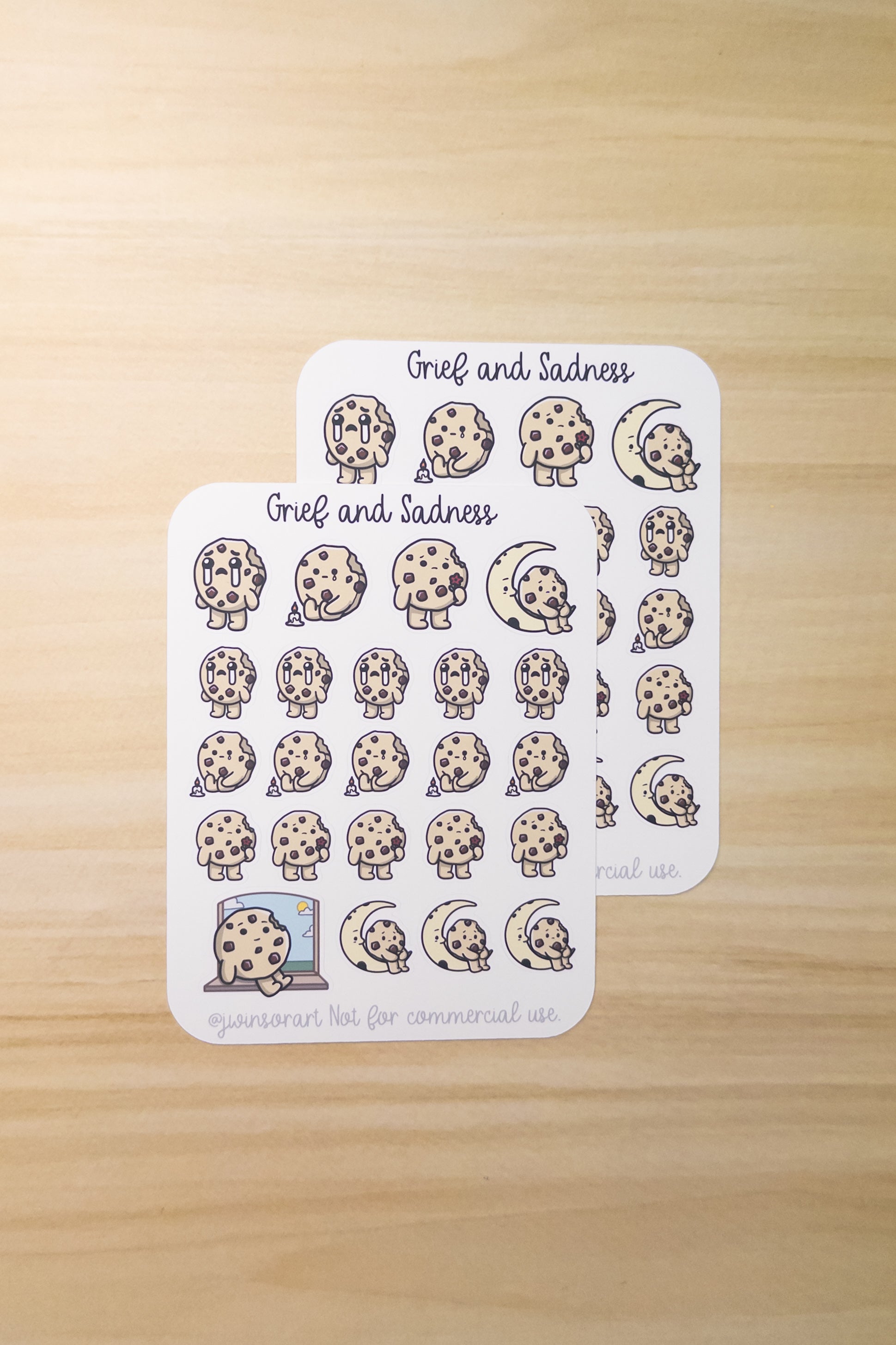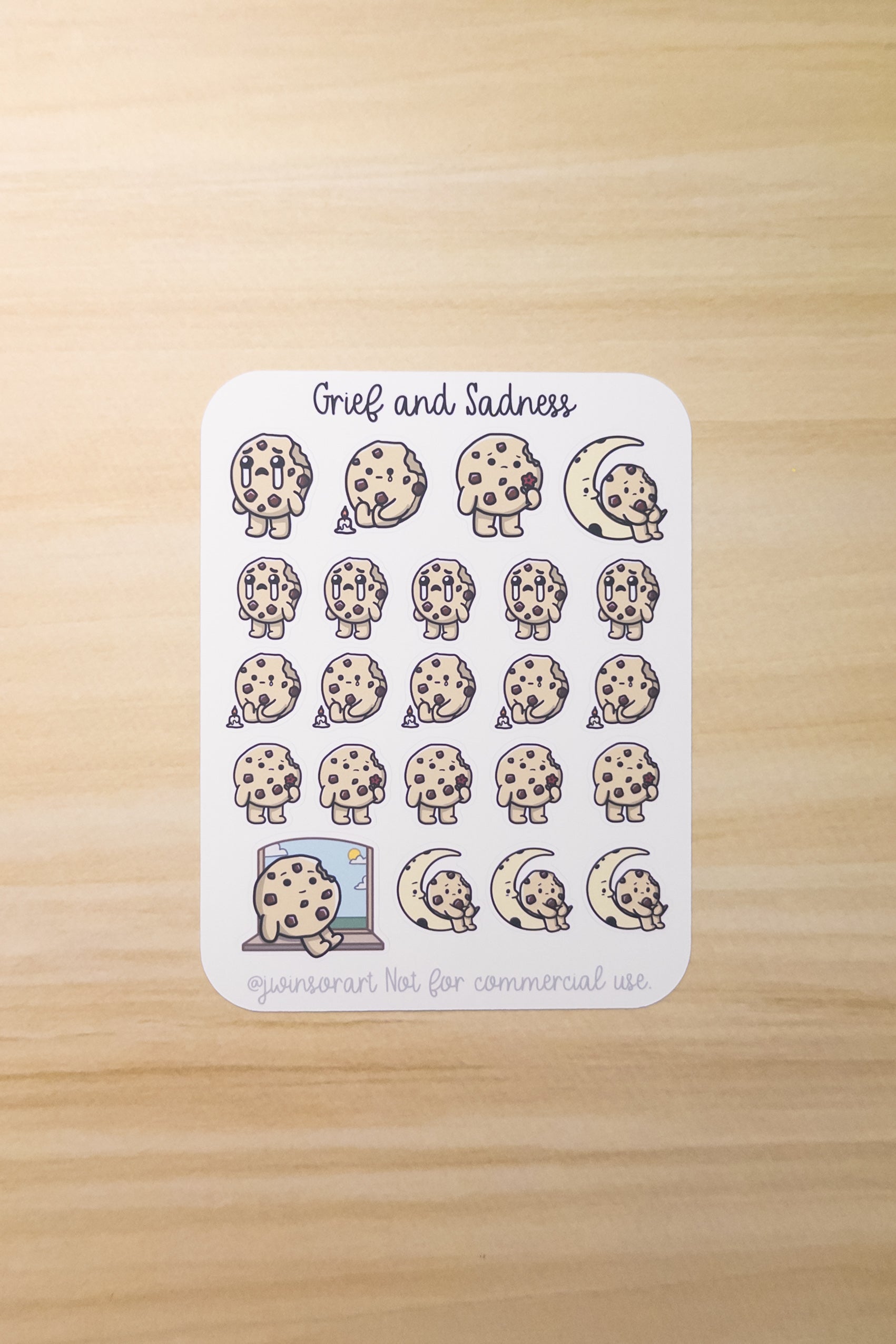 A solemn grief and sadness themed cookie sticker sheet for your planner, bullet journal, and other scrapbooking needs. Done in a simple, kawaii art style.