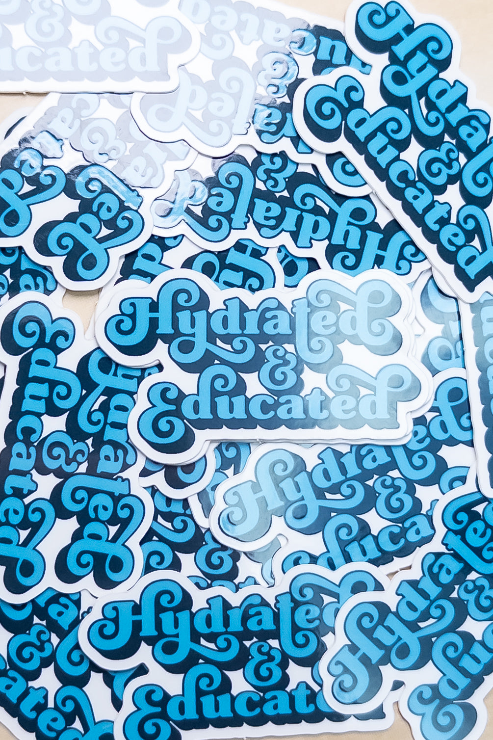 Hydrated & Educated Vinyl Sticker – 2" Retro Blue Quote Sticker – Waterproof Motivational Sticker for Laptop, or Water Bottle
