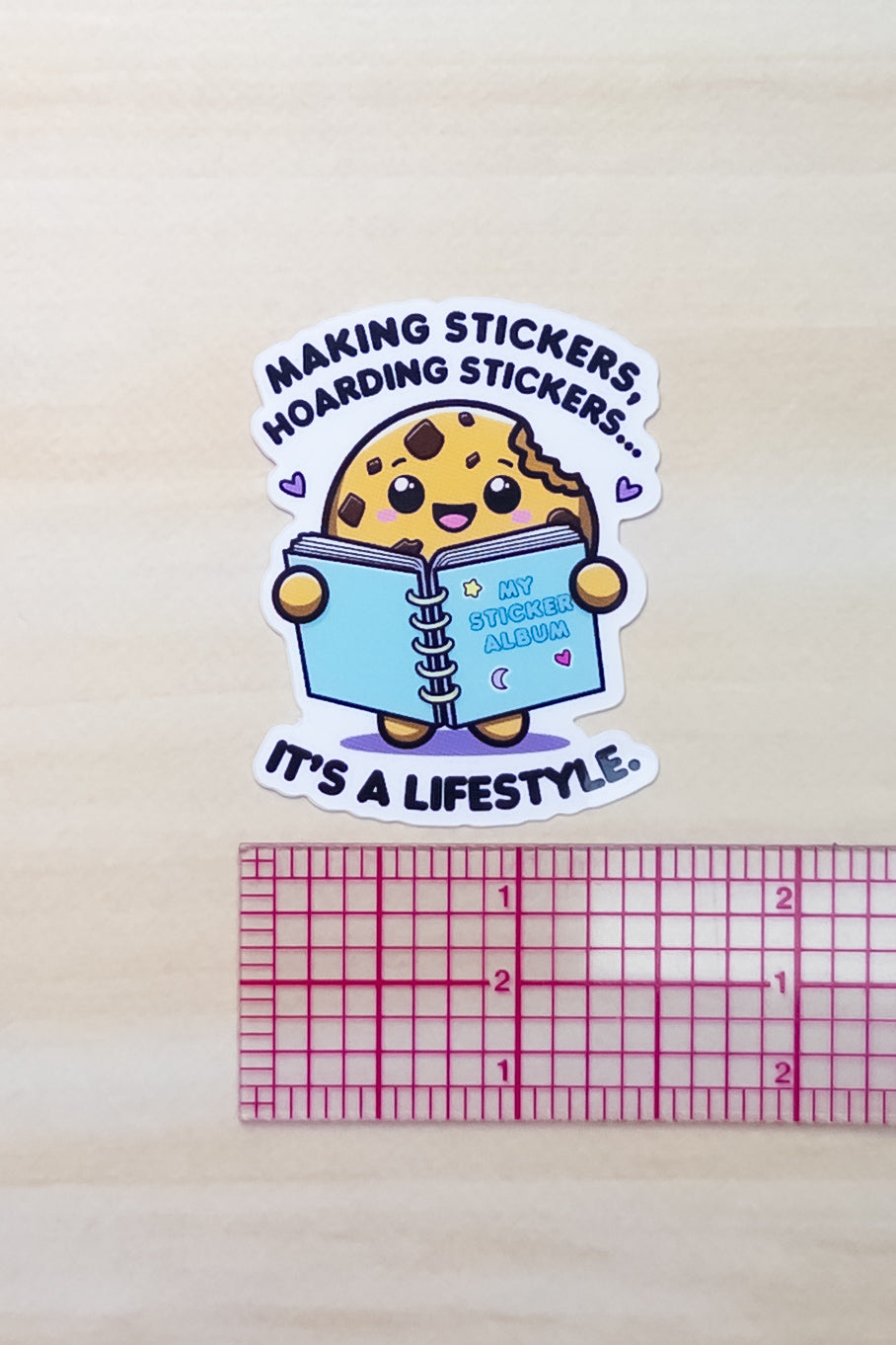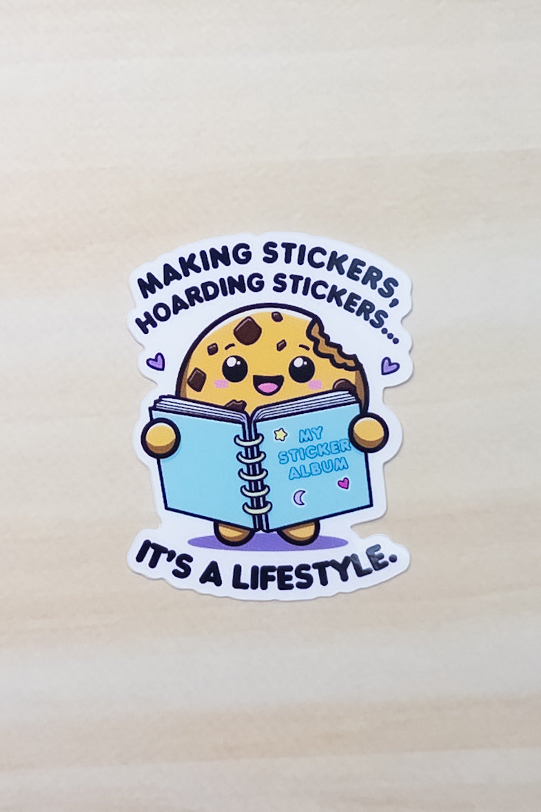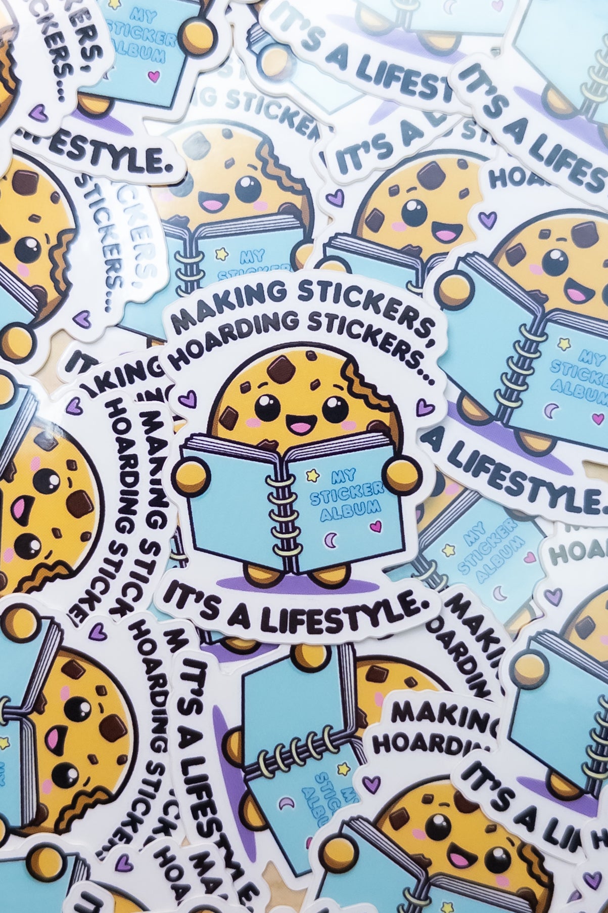 This listing is for one vinyl sticker that reads, "Making stickers, hoarding stickers... it's a lifestyle." Featuring my cookie mascot proudly holding a sticker album, this design is perfect for sticker makers and collectors alike. The vinyl sticker measures 1.5 inches by 1.9 inches. Sticker is weatherproof and has a glossy finish.