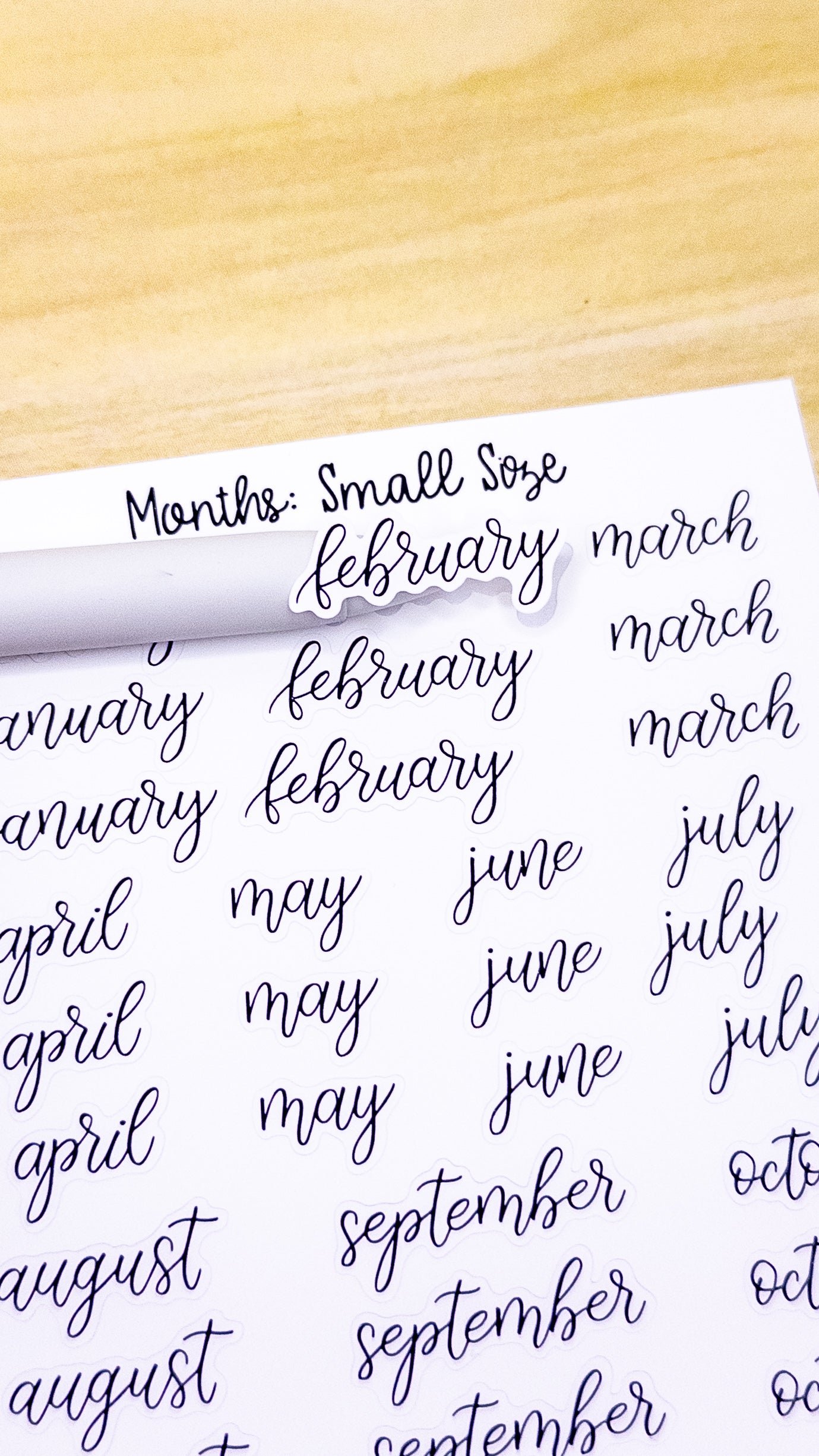 This listing is for one sticker sheet containing stickers for your planner, bullet journal, and other scrapbooking needs. Available in medium size script (12 stickers) and small size script (36 stickers). This sheet contains: