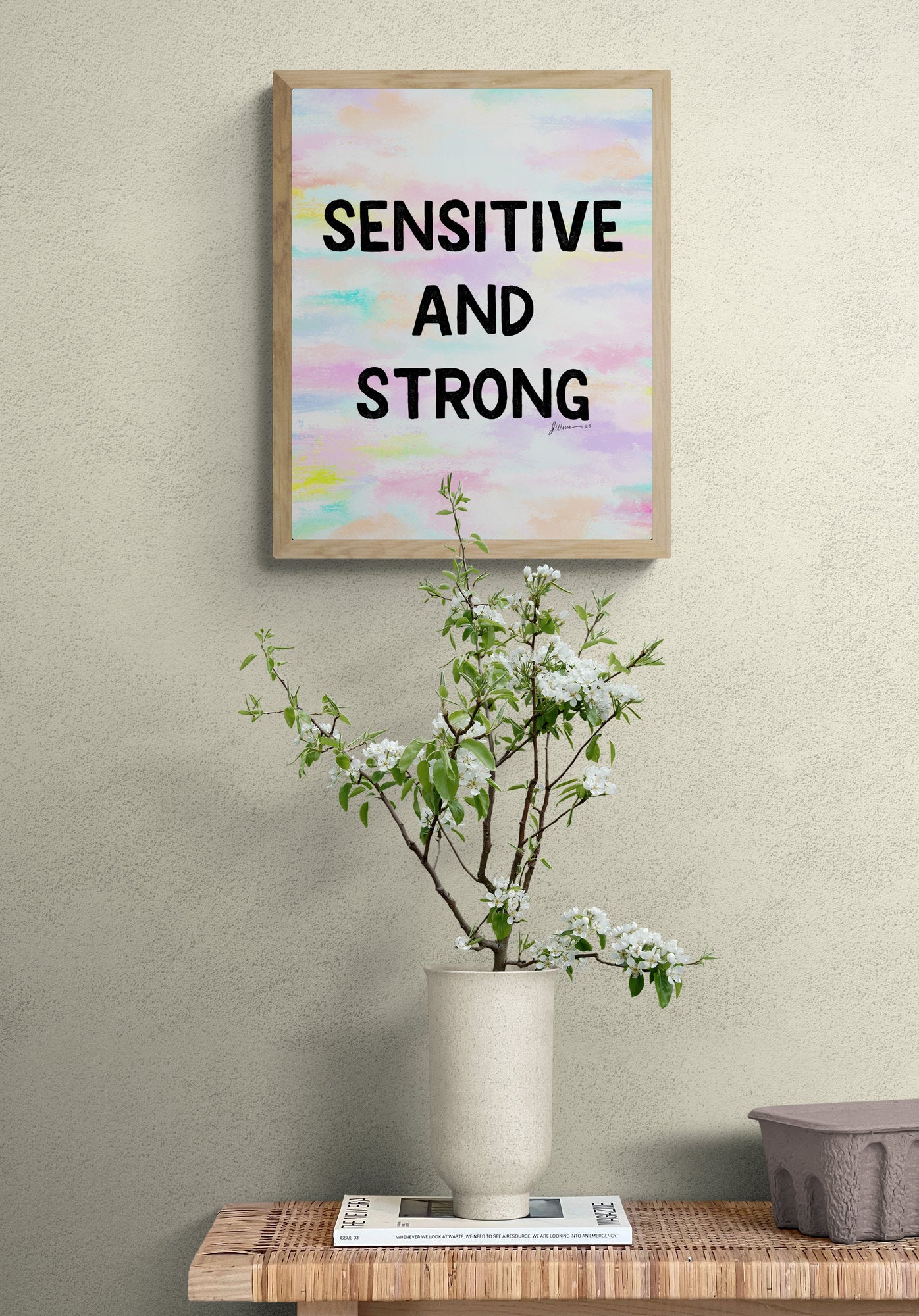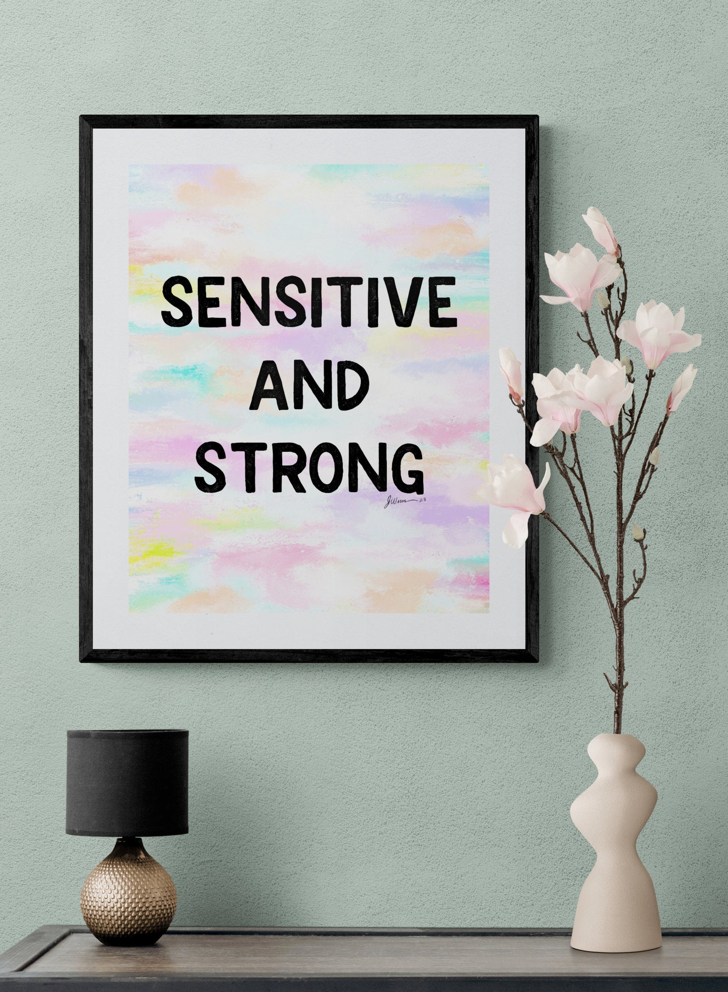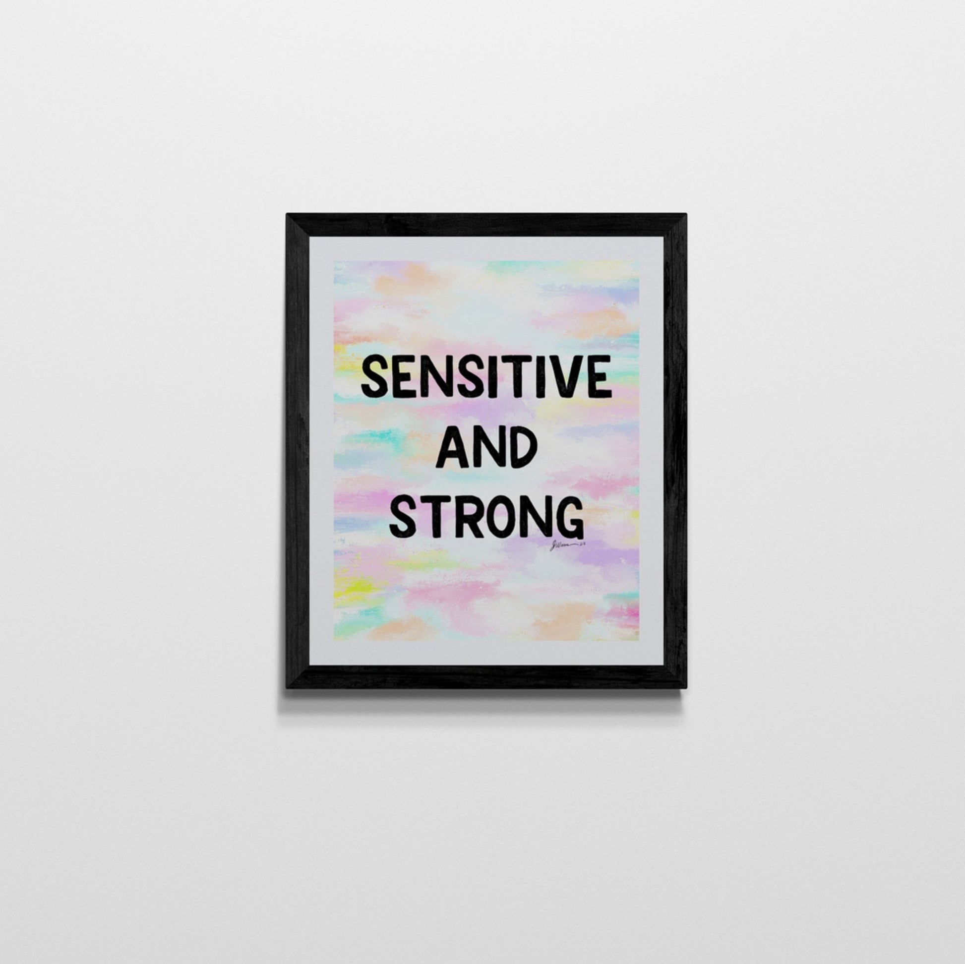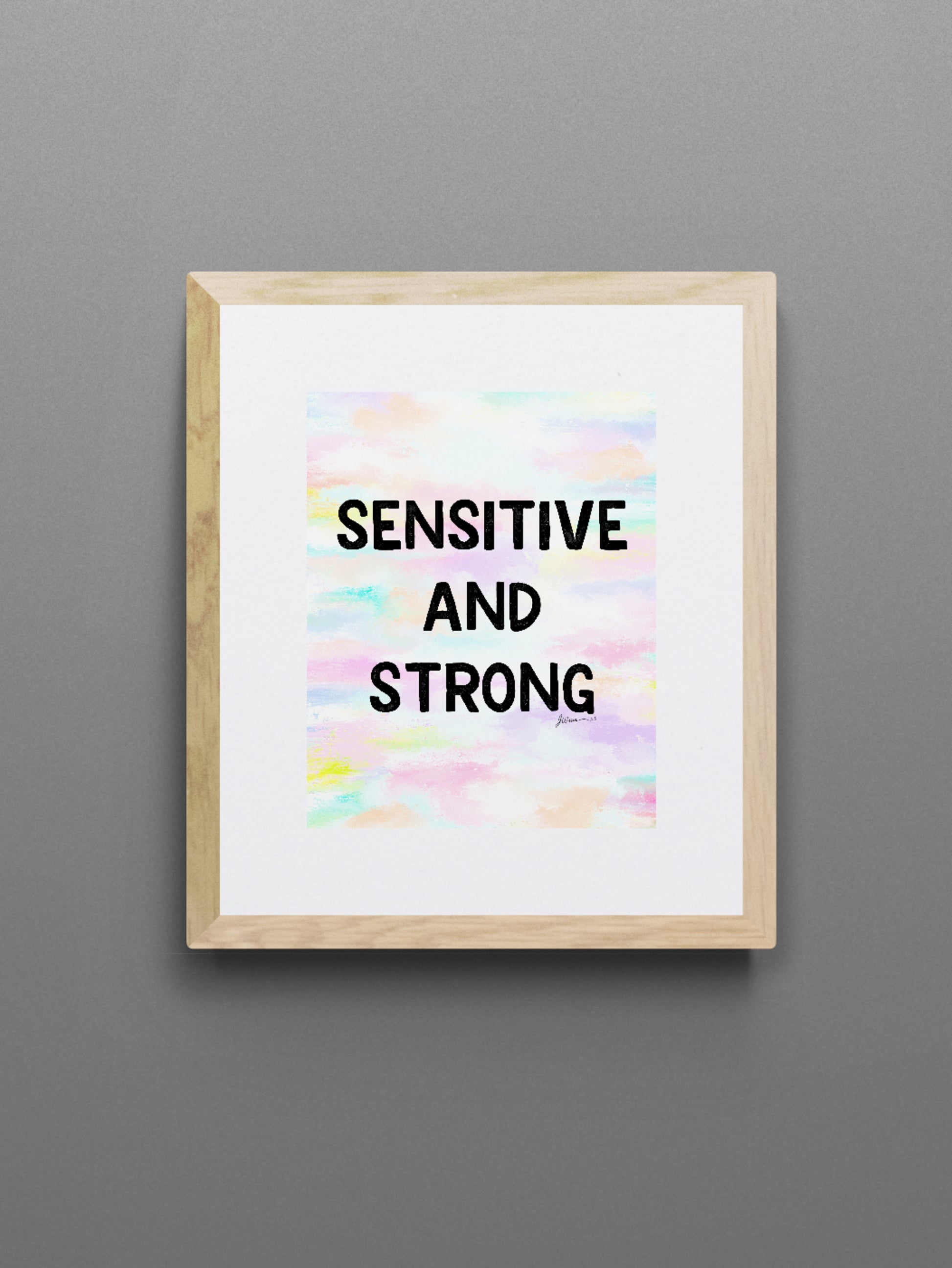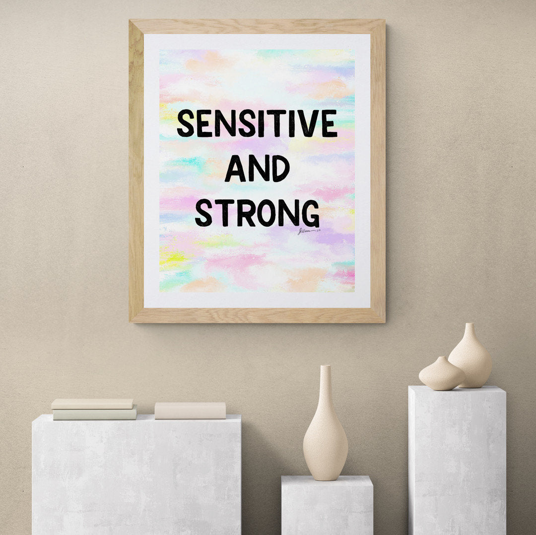 This listing is for a Giclée print of a digital piece of art. Bold text reads “SENSITIVE AND STRONG” on a colorful abstract background. Print only. NO FRAME INCLUDED. Images with matting and framing are provided to help imagine how the piece might look in your space. The actual print you will receive is 8 inches by 10 inches and printed without a border.