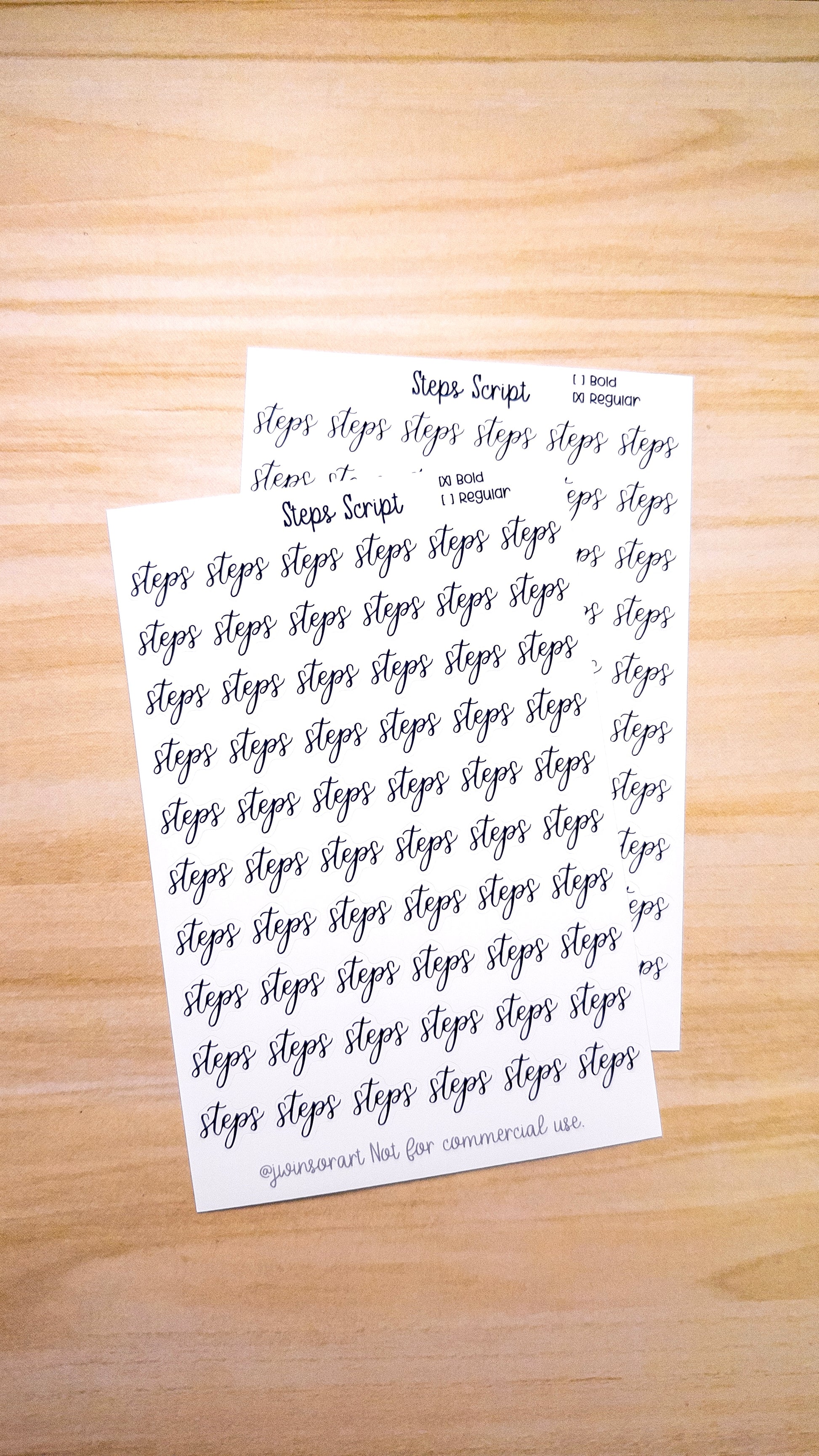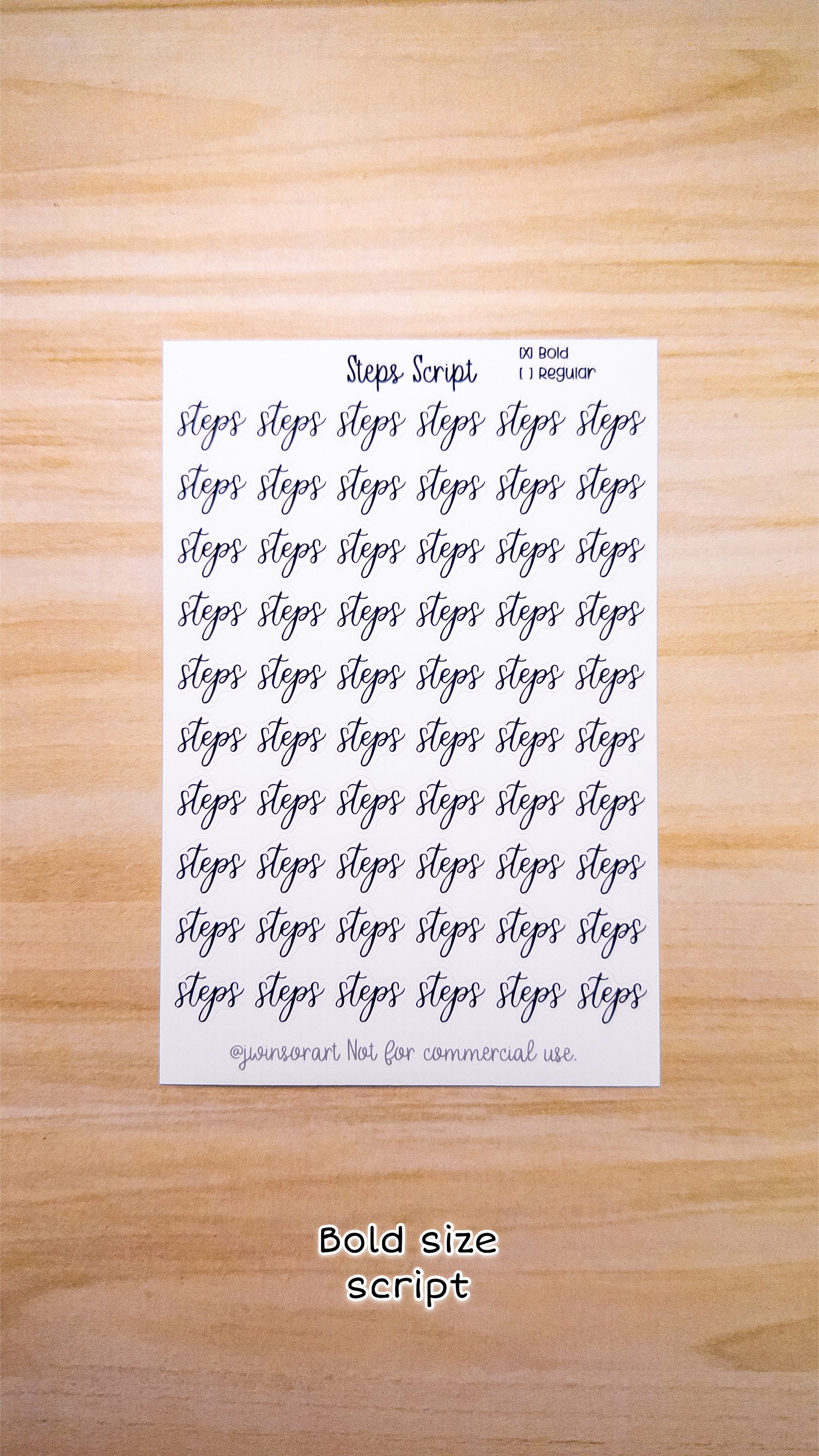 This listing is for one sticker sheet containing stickers for your planner, bullet journal, and other scrapbooking needs. This sheet contains 60 copies of the word "steps" individually die cut.
