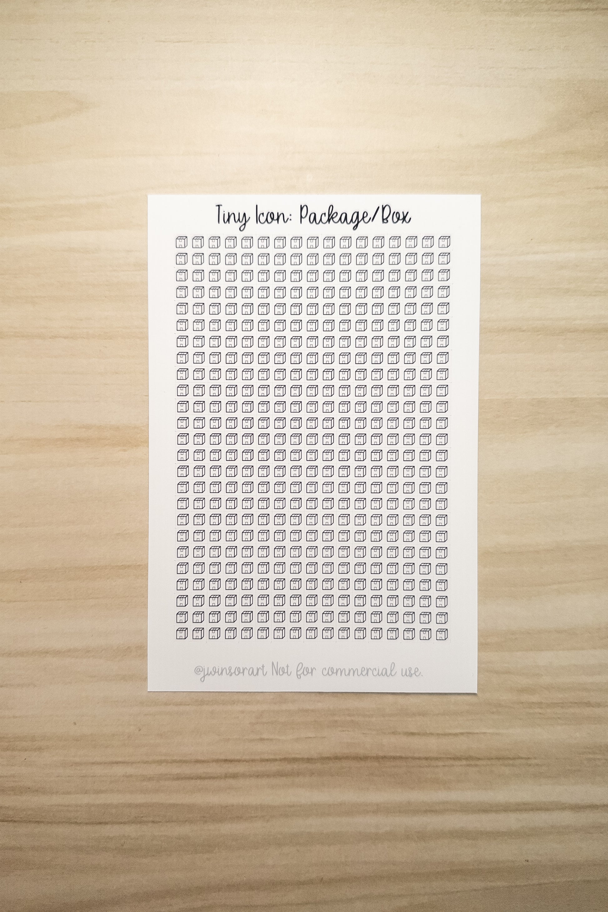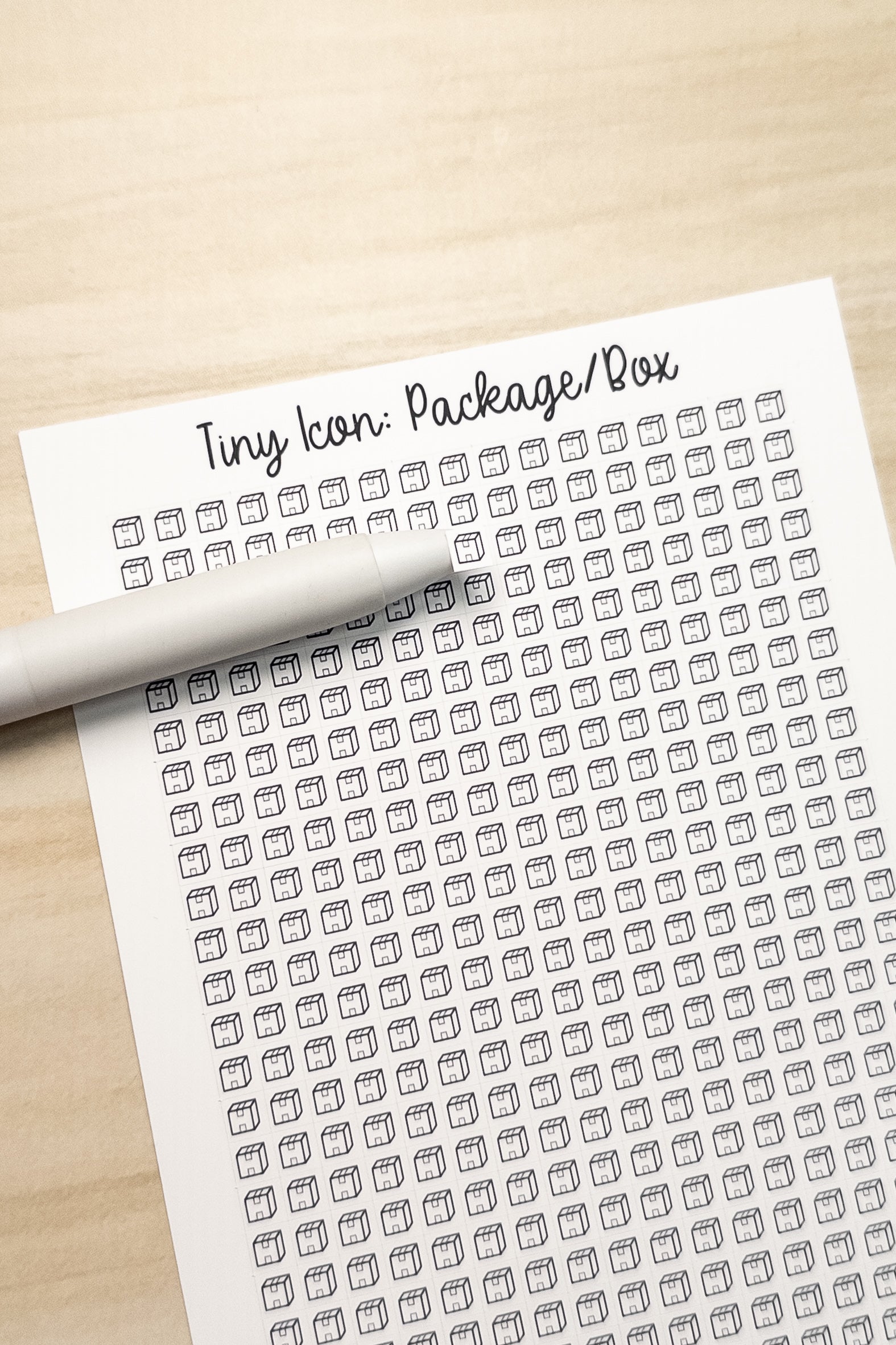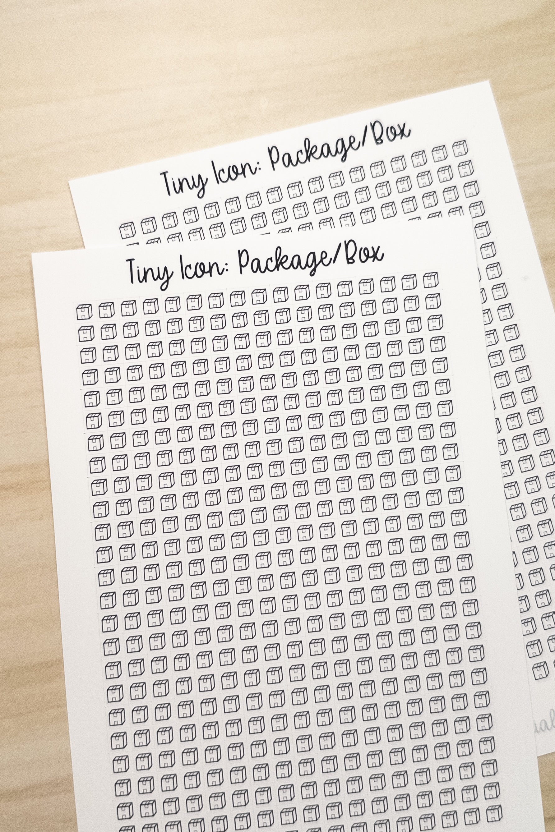 This listing is for one sticker sheet containing a tiny icon of a package/box for your planner, bullet journal, and other scrapbooking needs. A simple black-and-white icon to mark important deliveries, exciting shipments, and mail parcels in your planner. Perfect for anyone who gets mail frequently, meal order services, shop owners sending out orders, and any other occasions with boxes like moving.
