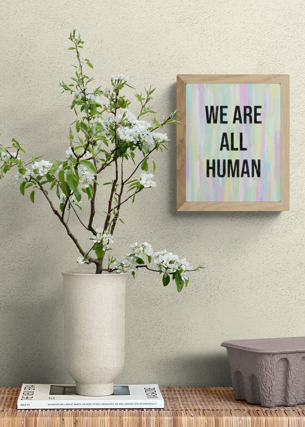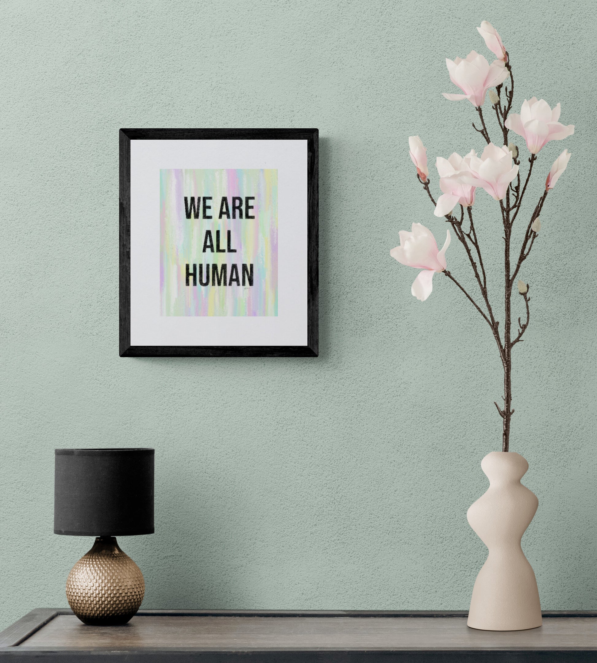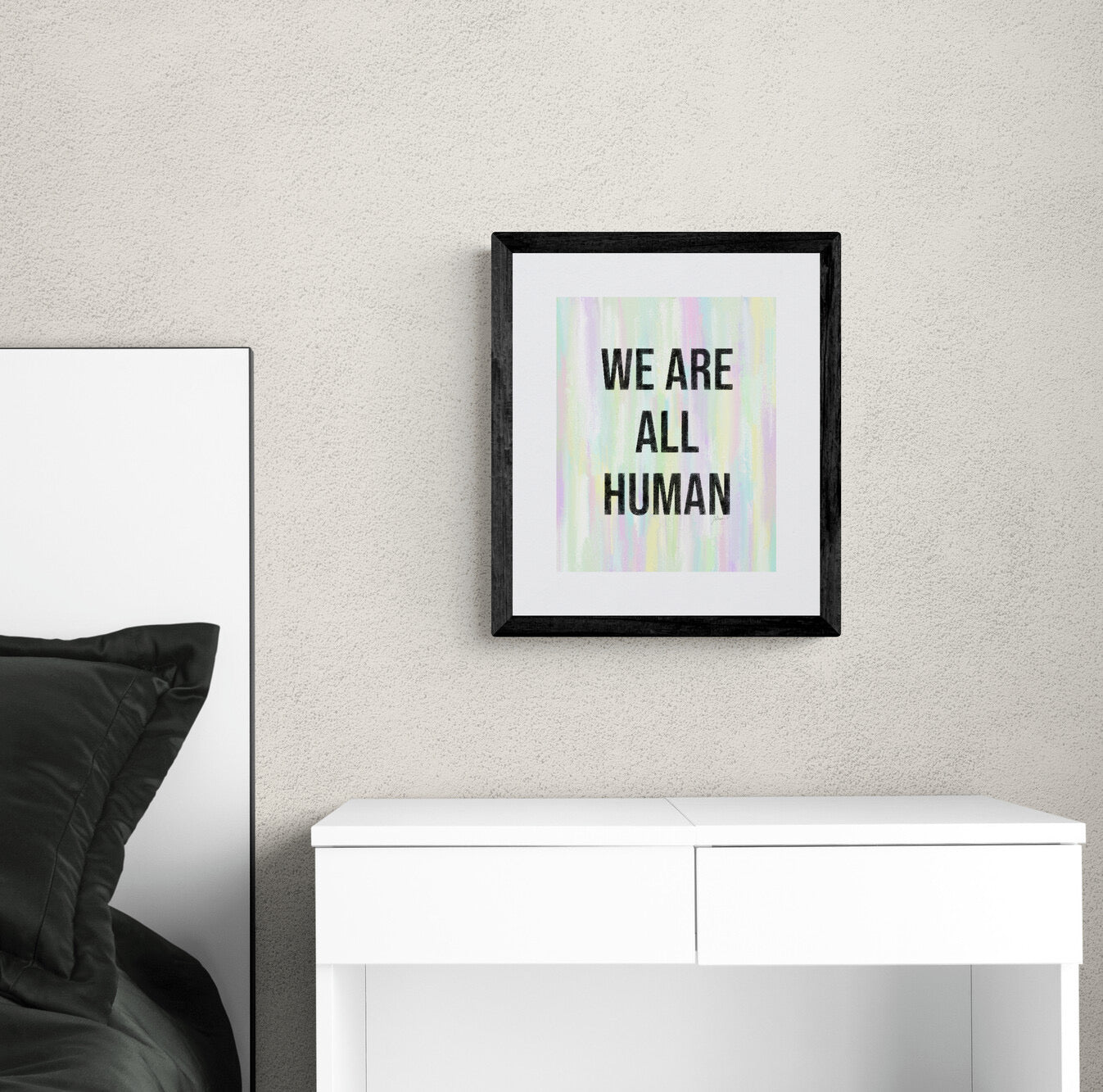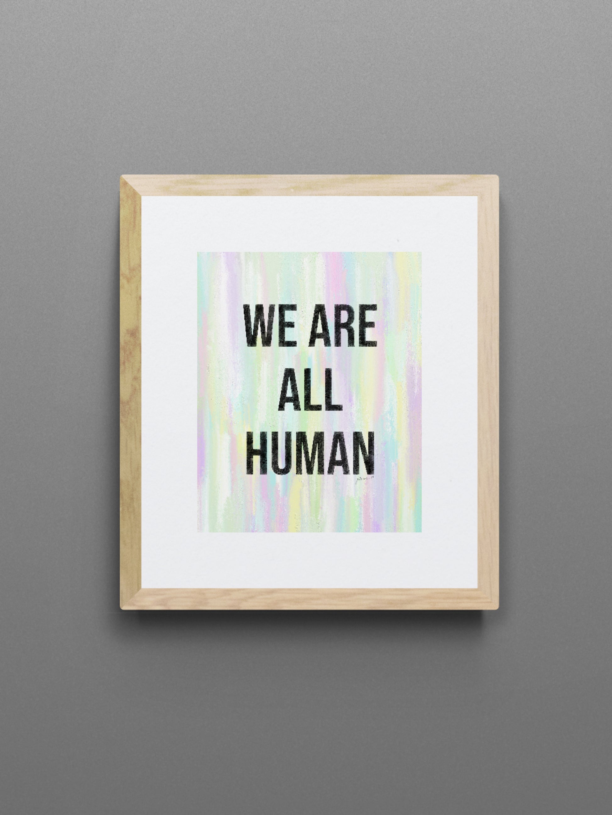 This listing is for a Giclée print of a digital piece of art. Bold text reads “WE ARE ALL HUMAN” on a colorful abstract background. Print only. NO FRAME INCLUDED. Images with matting and framing are provided to help imagine how the piece might look in your space. The actual print you will receive is 8 inches by 10 inches and printed without a border.