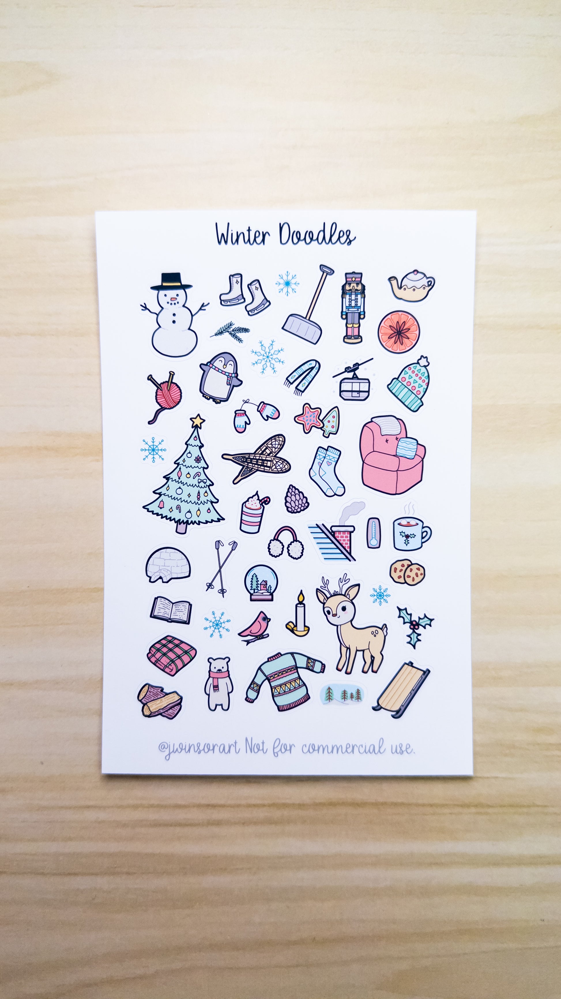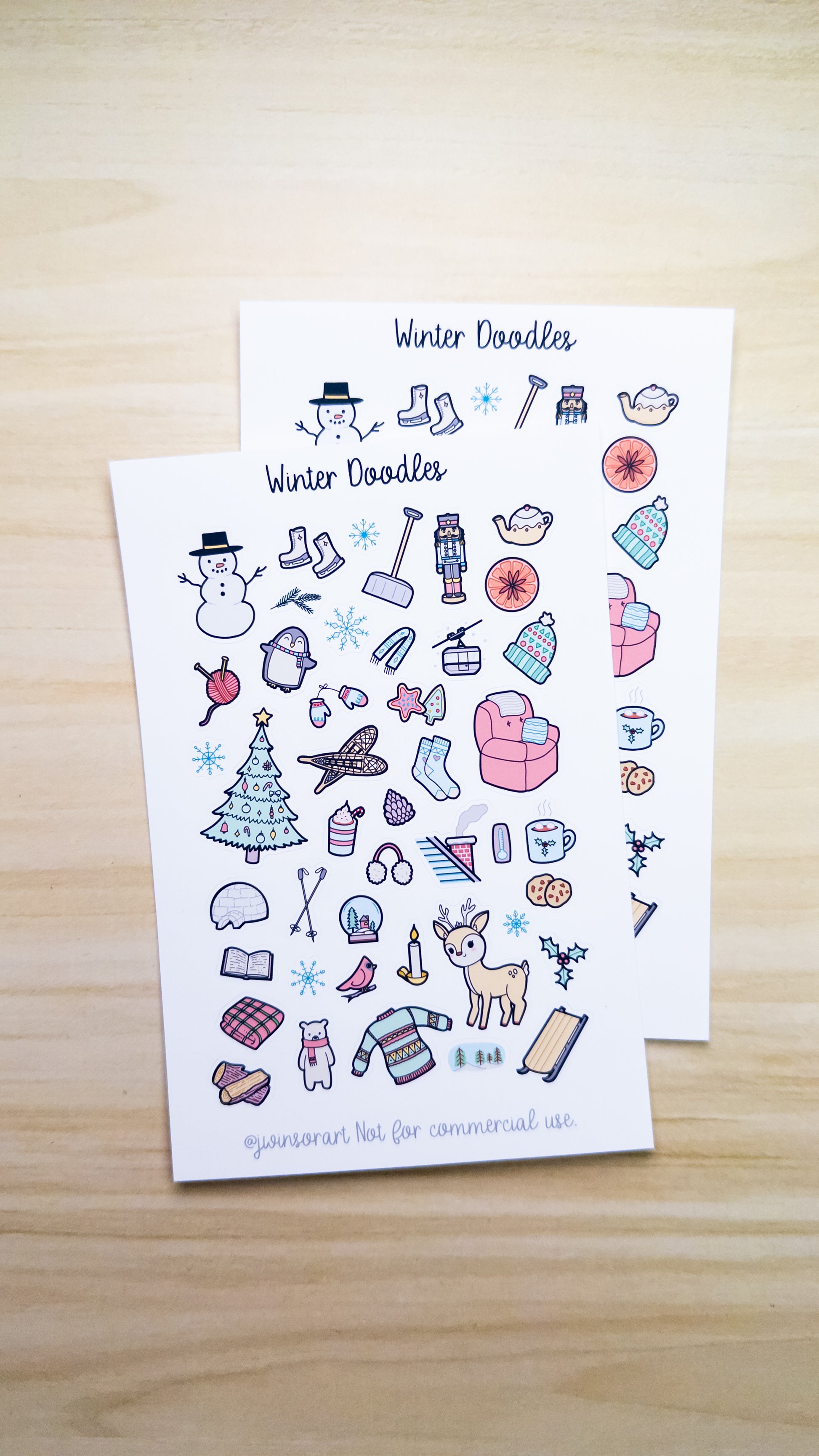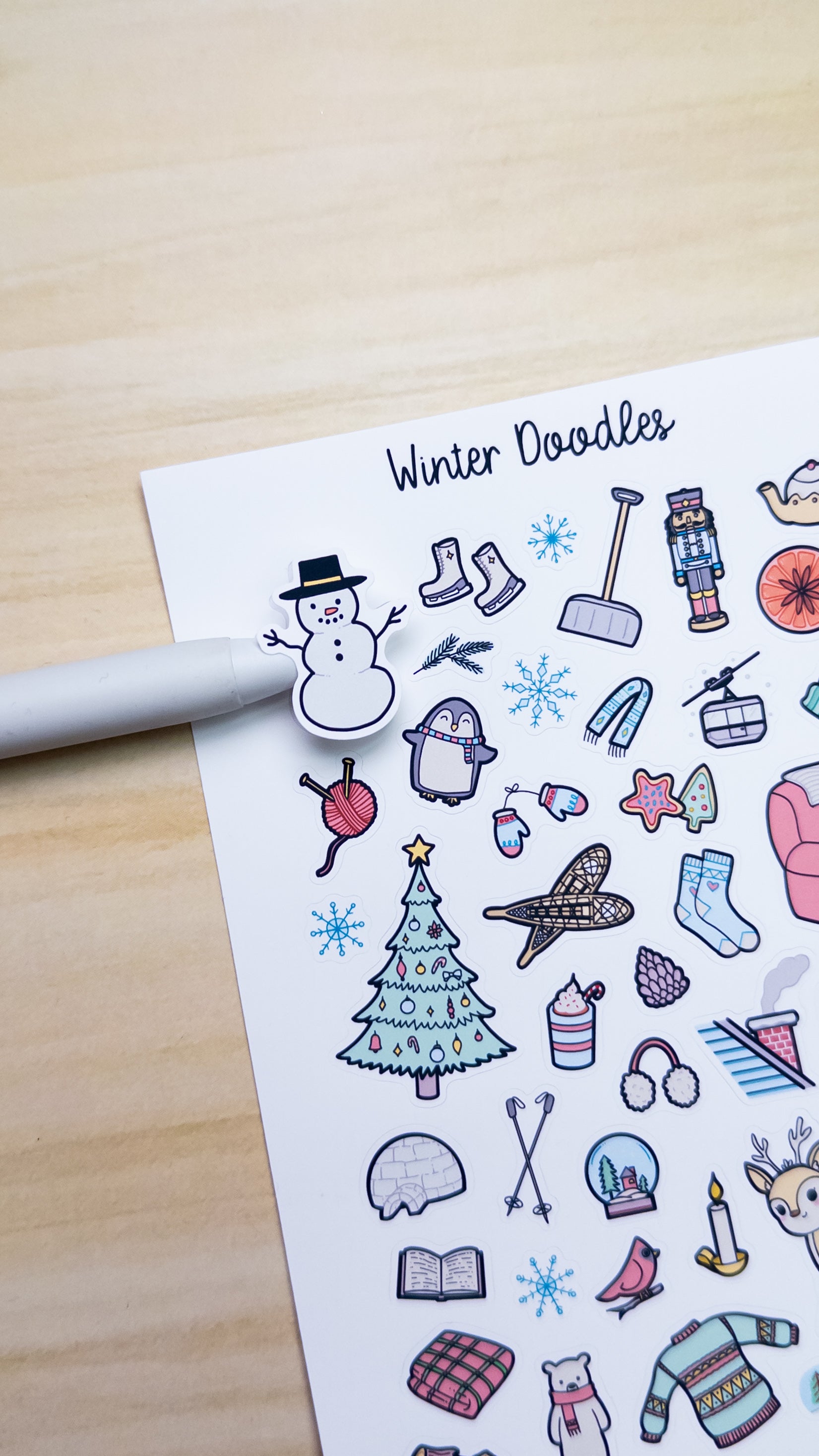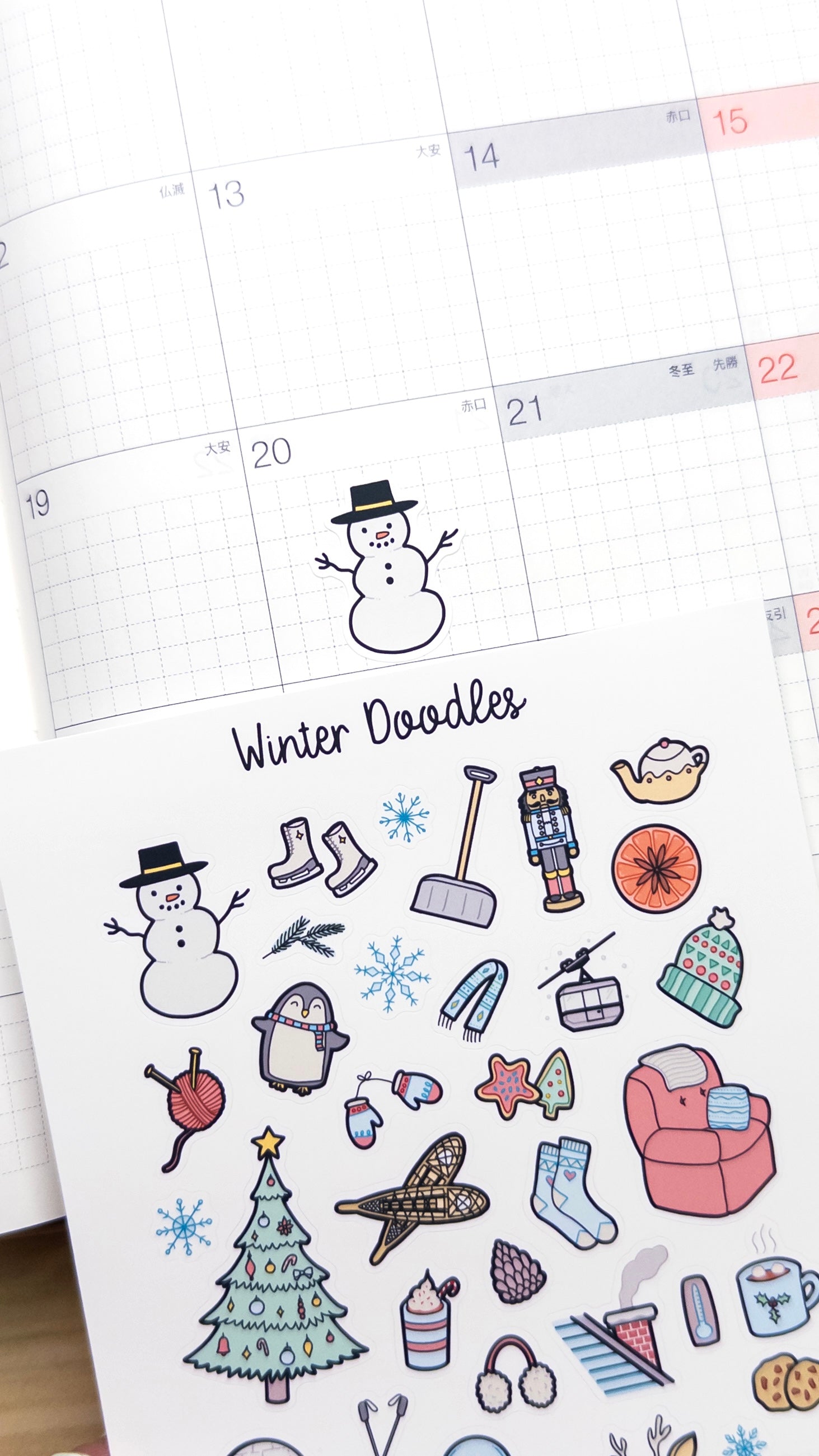 Winter Doodles Deco Planner Sticker Sheet Snow Penguin Deer Igloo Blanket Tree Nutcracker Tea Cozy Mittens Cardinal Ice Bujo Cute Kawaii